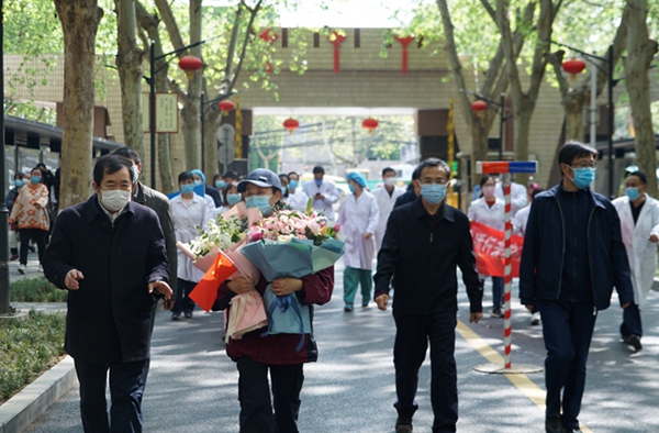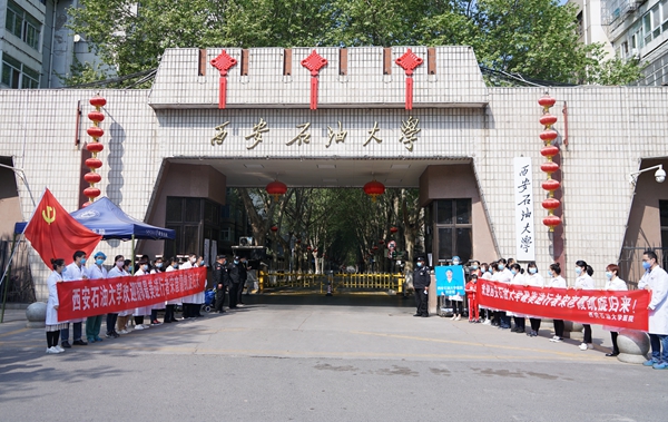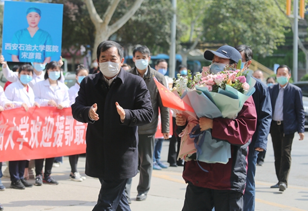 4月8日上午,宋彦霞护士结束了14天的隔离观察期,从隔离观察点返回学校。校党政领导李天太、张木、苏文甫,相关部门负责人及校医院部分职工在雁塔校区东门迎接宋彦霞护士。
