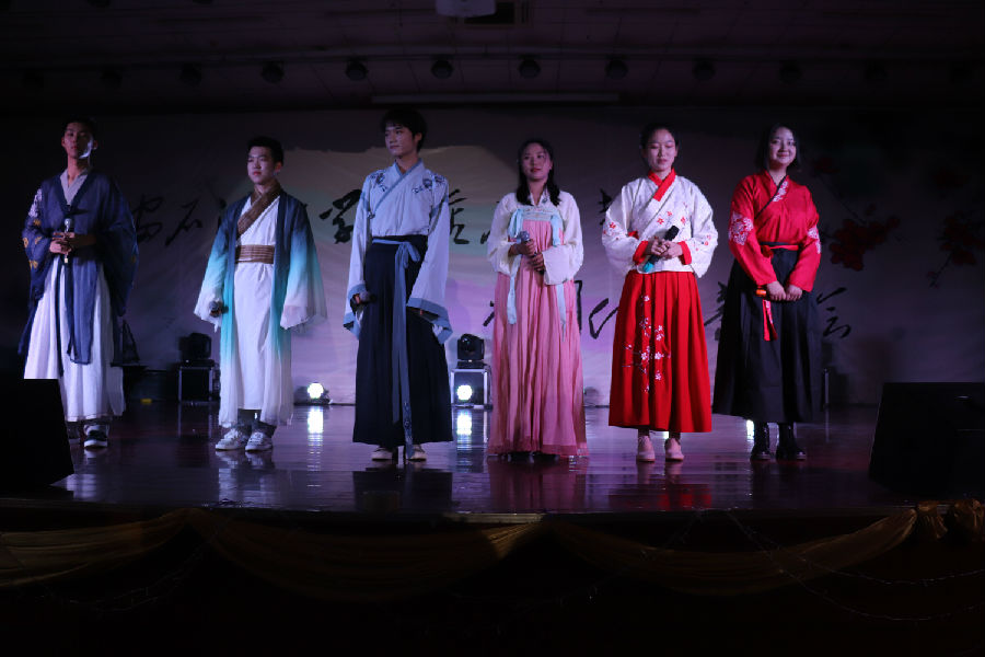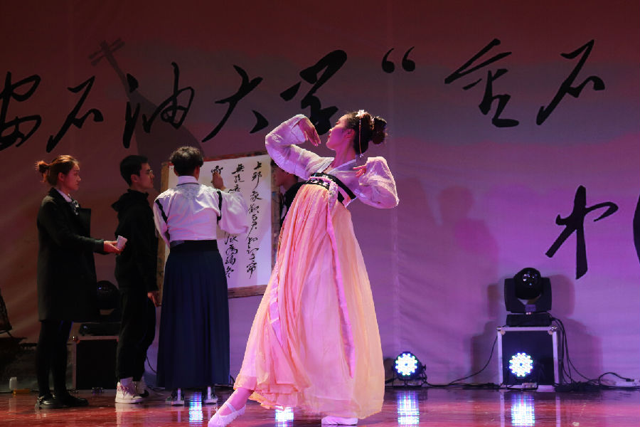 接下来音乐会正式开始。一首婉转悠扬的陕北民歌《叫一声哥哥快回来》将我们带入传统民族音乐氛围中;接着又是动态美与民族美的结合,哈萨克族的同学们献出动感十足的民族舞蹈;长笛与二胡奏出一曲“美丽的神话”;人文学院与材料学院同学合作演出京剧《春闺梦》;藏族姑娘卓尔丹舞出庄重优美的《转山》,新疆小伙弹着冬不拉唱起《明月思故乡》……最后,人文学院卢强老师带领两位学生在动听的中国古典音乐和舞蹈的背景下挥毫泼墨,创作了精彩的书法作品。