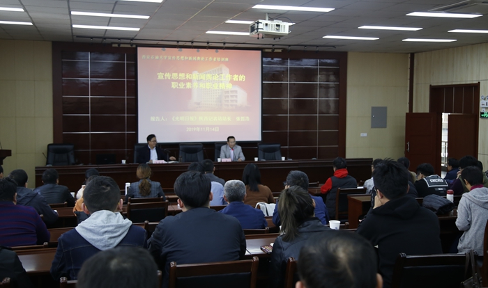11月14日下午,党委宣传部在雁塔校区第五会议室举办了宣传思想和新闻舆论工作者培训班,邀请《光明日报》陕西记者站站长、西北大学兼职教授张哲浩老师来校作报告。校党委委员、宣传部部长李国武主持报告会。各院系级单位党组织、机关党委各党总支、各教工党支部的宣传委员,各院系教工通讯员,宣传部全体工作人员共100余人参加报告会。