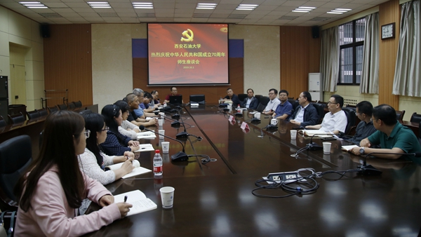 10月1日中午,学校庆祝中华人民共和国成立70周年座谈会在雁塔校区第二会议室召开。校党委书记赛云秀出席会议,校党委副书记雷西合主持会议。党政办公室、纪委监察处、组织部、宣传部、统战部、教师工作部、保卫部、研究生工作部负责人,马克思主义学院、经济管理学院、人文学院、外国语学院书记,马克思主义学院教师代表,研究生代表参加会议。