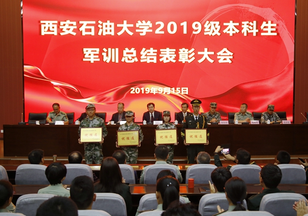 副校长陈军斌宣读了学校《关于表彰2019级本科生军训工作先进集体和优秀个人的决定》。总会计师樊晓民为军训旅旅部优秀干部颁奖。