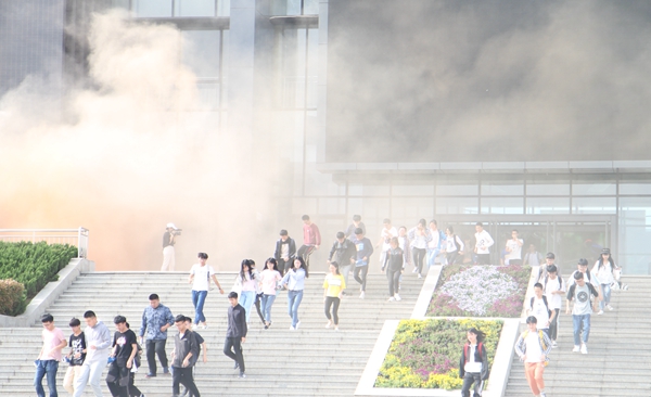 讲座结束后,保卫处联合学生处、图书馆,在化学化工学院、电子工程学院、机械工程学院、计算机学院、经济管理学院的支持下,组织500余名学生在鄠邑校区图书馆进行了防火避震应急疏散逃生演练。为了模拟火灾现场的烟雾场景,在图书馆南门两侧燃放了消防演习烟雾弹,随着警报信号的发出,同学们有序地离开图书馆,500余名师生在5分钟内安全撤离到达指定地点。