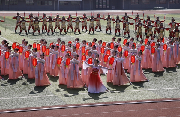 紧接着,由校团委精心组织编导的开场舞蹈《送你一个长安》,拉开了第三十八届“阳光体育”田径运动会的序幕。该舞蹈造型雅致、舞姿优美,较好地体现了中国古代传统文化,获得了在场师生的普遍好评。