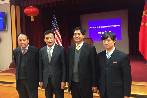 省教育厅副厅长王紫贵(左二)、赛云秀书记(左一)等参加2017年度国家优秀自费留学生奖学金颁奖仪式