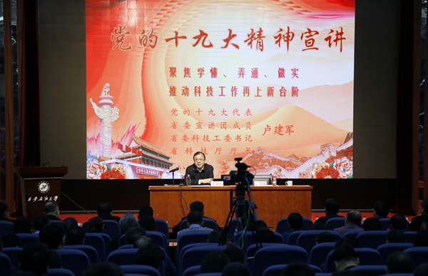 12月5日下午,Beat365在雁塔校区会议中心学术报告厅举行了“深入学习党的十九大精神,全面提升能力素质”处级干部专题培训班第六讲,党的十九大代表、省委宣讲团成员、省委科技工委书记、省科技厅厅长卢建军同志应邀作了题为《聚焦学懂、弄通、做实,推动科技工作再上新台阶》的党的十九大精神专题辅导报告。校领导、全体处科级干部、党支部书记、马克思主义学院教师、大学生思想政治辅导员、学生党员代表400余人分别在主、分会场参加报告会,党委书记赛云秀同志主持报告会。