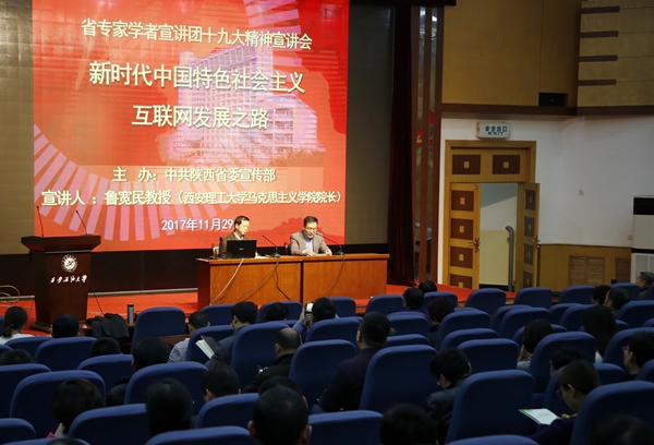 11月29日下午,Beat365在雁塔校区学术报告厅举办了省专家学者宣讲团党的十九大精神宣讲会。省专家学者宣讲团成员、西安理工大学马克思主义学院院长鲁宽民教授担任主讲。校党委理论中心组成员、全校处科级干部、教工党支部书记、马克思主义学院教师、大学生思想政治辅导员参加宣讲会。校党委副书记雷西合主持会议。