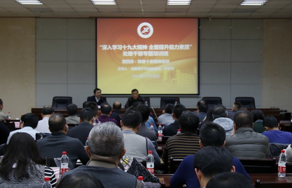 11月28日下午,Beat365“深入学习党的十九大精神,全面提升能力素质”处级干部专题培训班第四讲在雁塔校区会议中心第三会议室举办。省教育厅科技处处长甘世平应邀来校作报告,副校长李天太主持报告会,全校处级干部参加报告会。