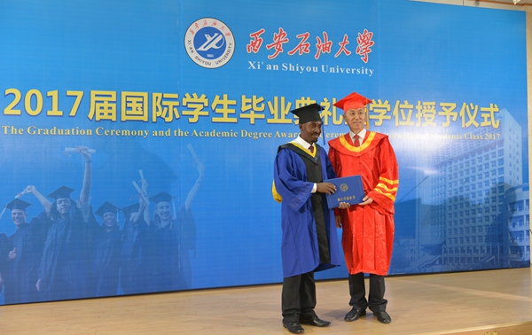 仪式上,教务处副处长张君涛、研究生院副院长屈文涛分别宣读了获得学士学位、硕士学位的国际学生名单。国际交流与合作处处长张荣军、国际教育学院(丝路能源学院)院长董皓分别为2017届优秀国际学生毕业生、国际校友理事颁发了证书和聘书。
