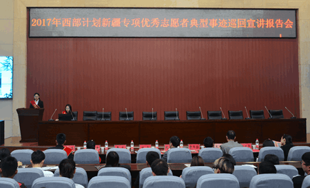 4月17日下午, 2017年西部计划新疆专项优秀志愿者典型事迹巡回宣讲报告会在新校区图书馆弘石学术报告厅举办。共青团陕西省委党组成员、陕西省少先队总辅导员、西部计划陕西省项目办主任赵大胜,校党委副书记雷西合,共青团陕西省委志工部副部长陈晓华出席活动。西部计划新疆专项优秀志愿者田宇、李蕊、席玉峰、吴旭东作了宣讲报告。Beat365学生工作部、校团委负责人与四百余名师生听取了报告。