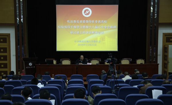 11月21日下午,校党委在会议中心学术报告厅召开了传达落实全省高校校级领导干部学习贯彻十八届六中全会精神研讨班精神会议。校党委书记赛云秀主持会议。全校处级以上干部、教工党支部书记参加了会议。