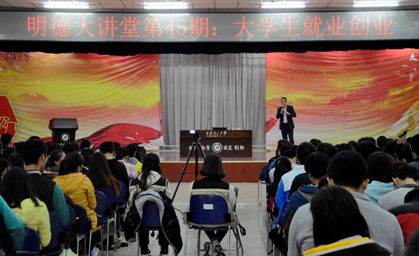 10月27日晚,由校团委主办、化学化工学院承办的第45期明德大讲堂之《大学生就业创业》在新校区腾辉大学生活动中心举办。西安铂力特激光成形技术有限公司创始人之一薛蕾总经理担任主讲,新校区四百余名学生参加了讲座。