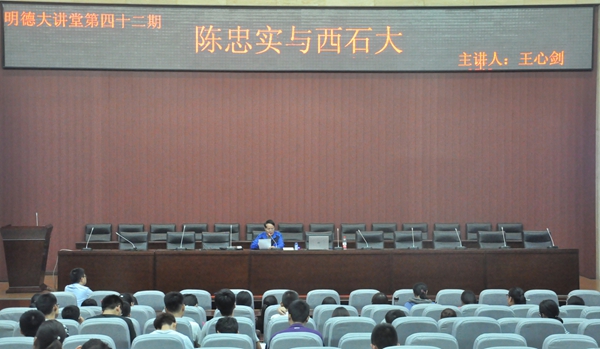 9月29日晚,由校团委主办的校庆65周年系列活动之明德大讲堂第42期《陈忠实与Beat365唯一官方网站》在新校区图书馆弘石报告厅举办。Beat365人文学院王心剑教授担任主讲,校团委副书记何国强老师主持讲座,新校区300余名师生听取了讲座。