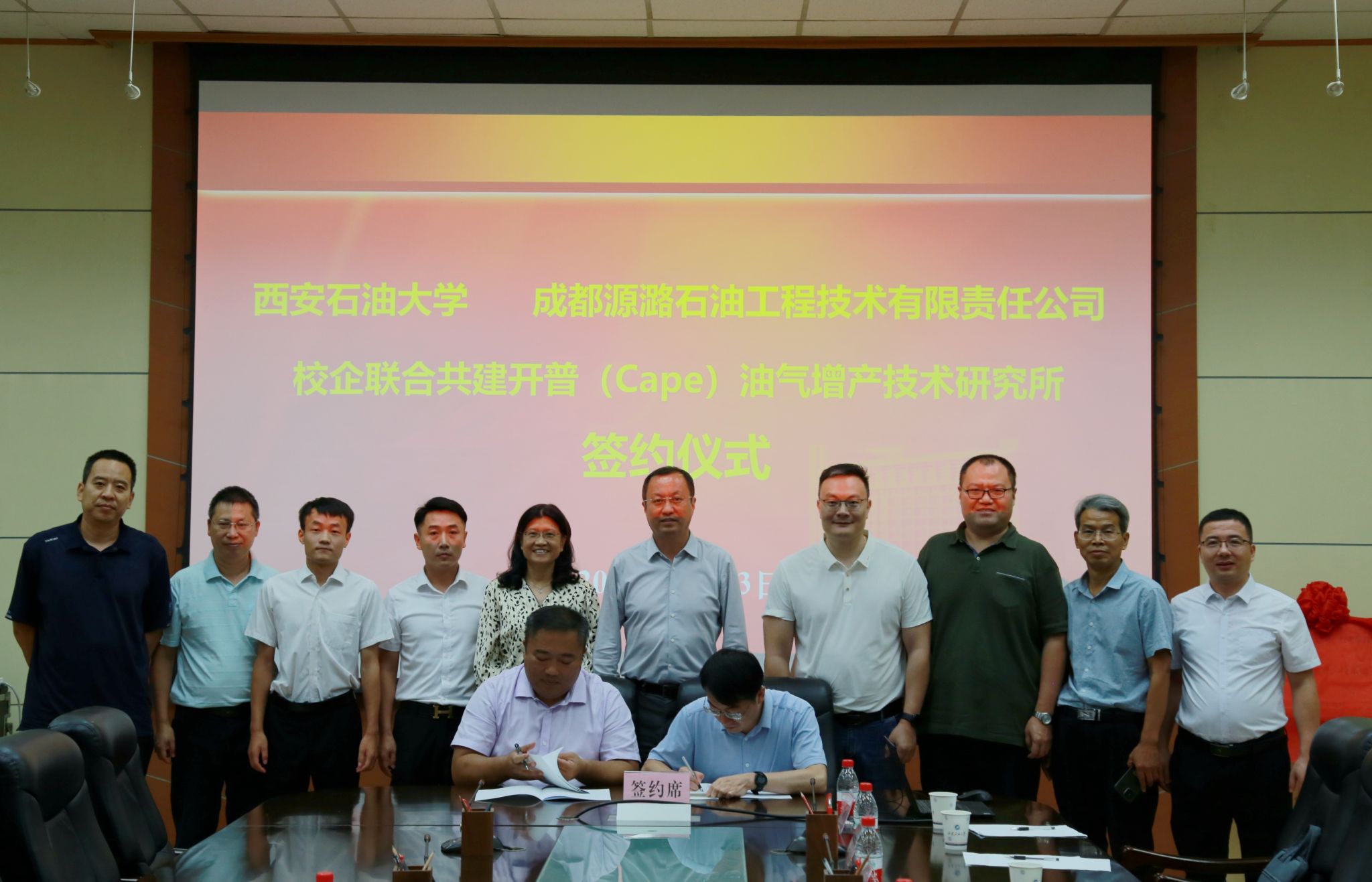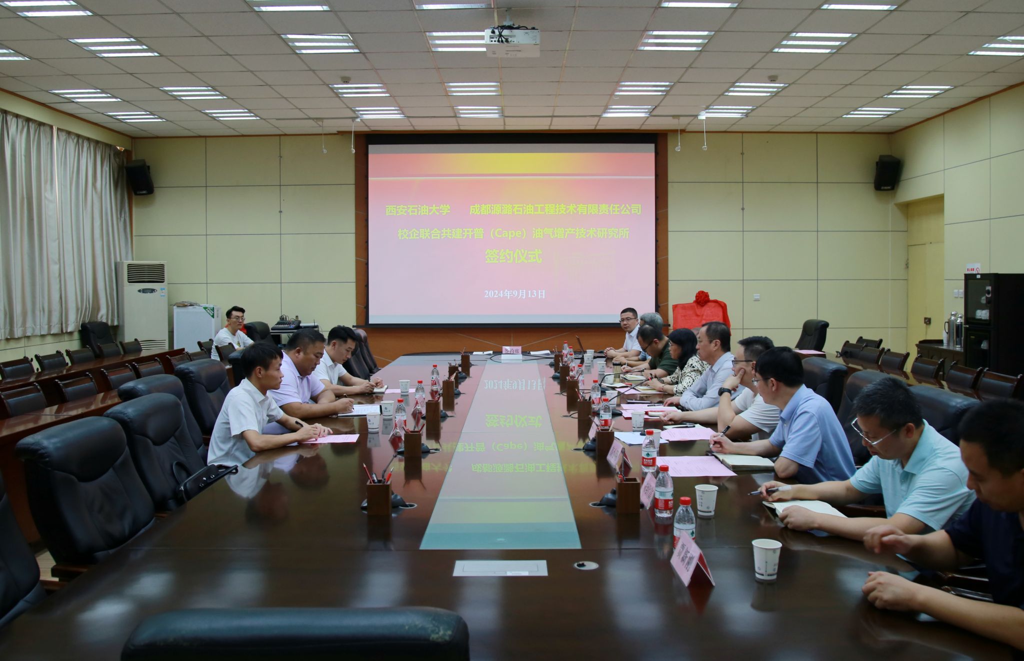 9月13日上午,Beat365唯一官方网站与成都源潞石油工程技术有限责任公司校企联合共建开普(Cape)油气增产技术研究所签约仪式在学校雁塔校区会议中心第一会议室举行,副校长张荣军出席签约仪式,成都源潞石油工程技术有限责任公司总经理陈造峰及有关部门负责人,科研处副处长屈乐,化学化工学院领导班子成员、各系主任、分析检测中心主任参加仪式。