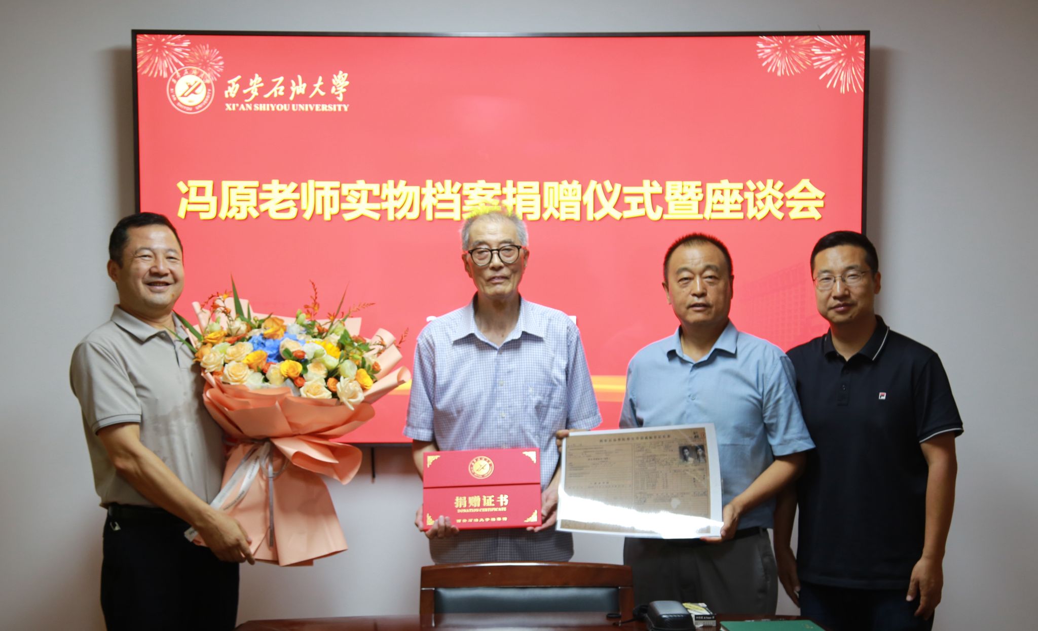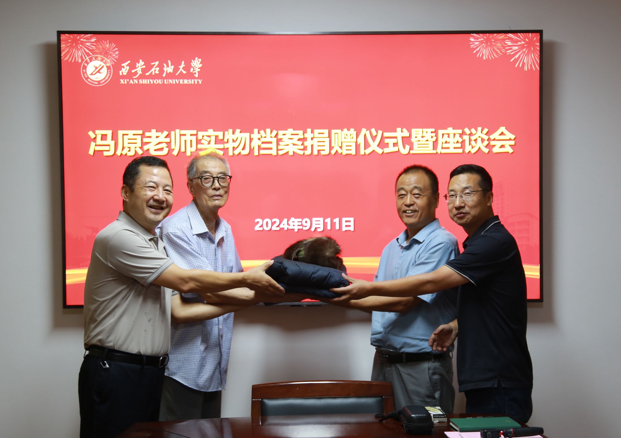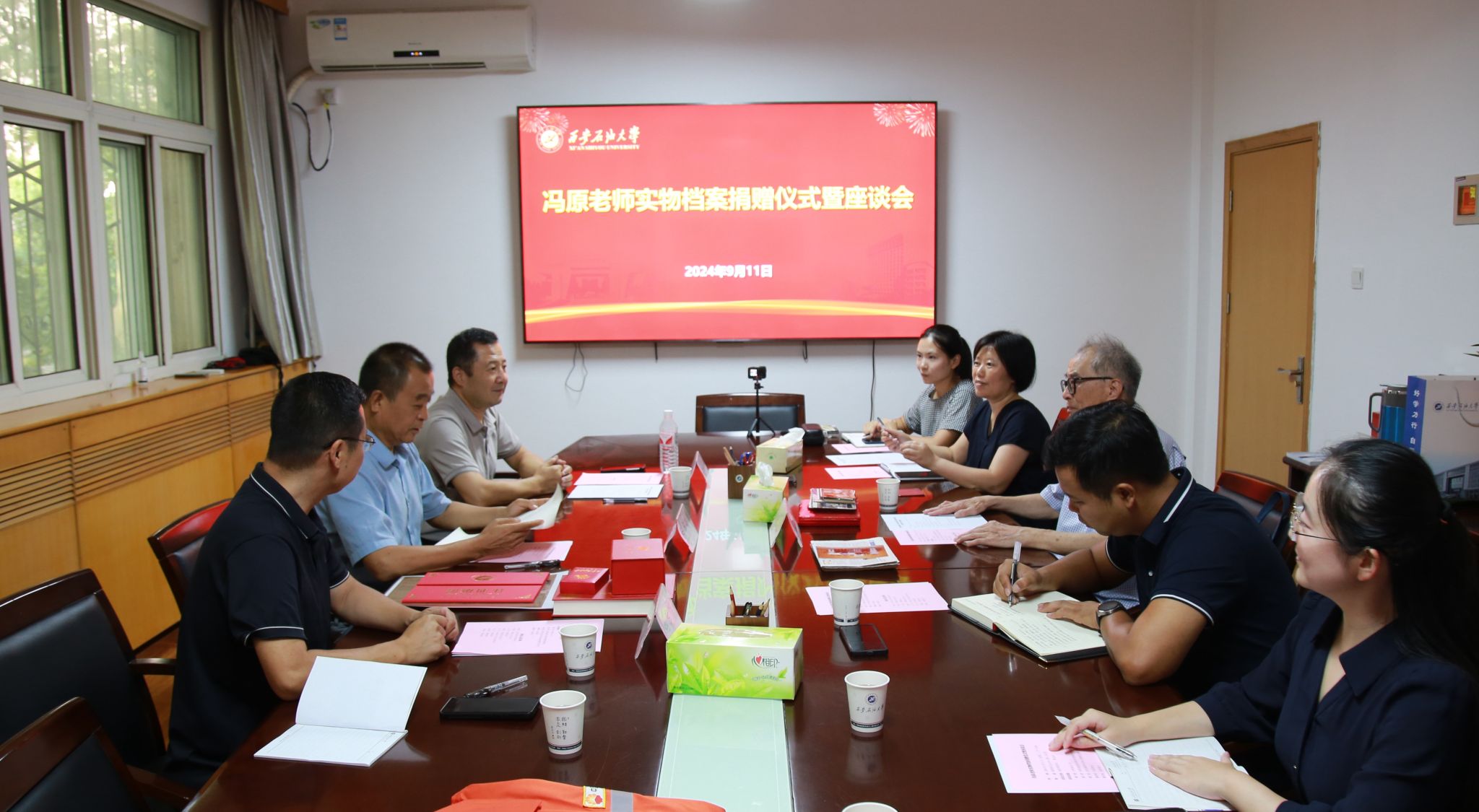 9月11日下午,Beat365退休教职工冯原老师向学校捐赠“新时期铁人”王启民为校庆50周年题词、大庆会战期间的工服鞋帽、西安石油学院毕业证书、老照片等珍贵实物档案。档案捐赠仪式在雁塔校区行政楼二楼会议室举行,会议由档案馆馆长马超主持,校党委副书记程永清,离退休工作处主要负责人及相关工作人员参加会议。