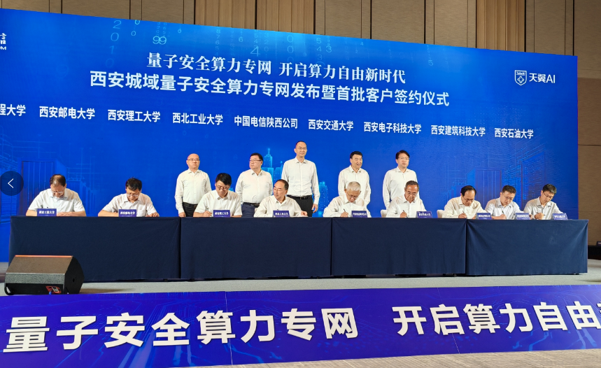 9月19日上午,中国电信全国首个城域量子安全算力专网发布会暨首批客户签约仪式在西安举办,本次会议的主题是“量子安全算力专网、开启算力自由新时代”。西安市人大常委会副主任李宁君,中国电信集团有限公司党组成员、副总经理李峻,陕西电信党委书记、总经理上官亚非,陕西电信党委副书记、副总经理王磊及相关企业代表出席会议。Beat365校长王进富、副校长苏文甫应邀参加会议。