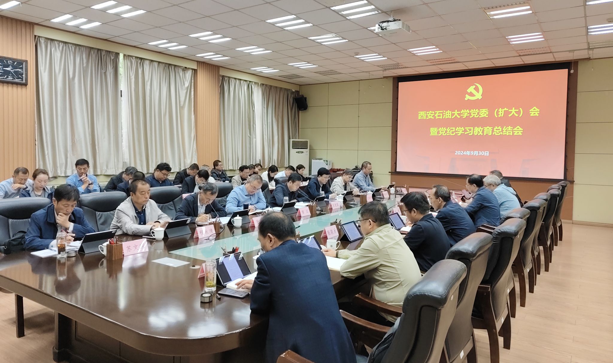 9月30日上午,学校在雁塔校区第一会议室召开党委(扩大)会暨党纪学习教育总结会。全体校领导、校党委委员、各院(系)级单位党组织书记参加会议。会议由校党委书记常江主持。