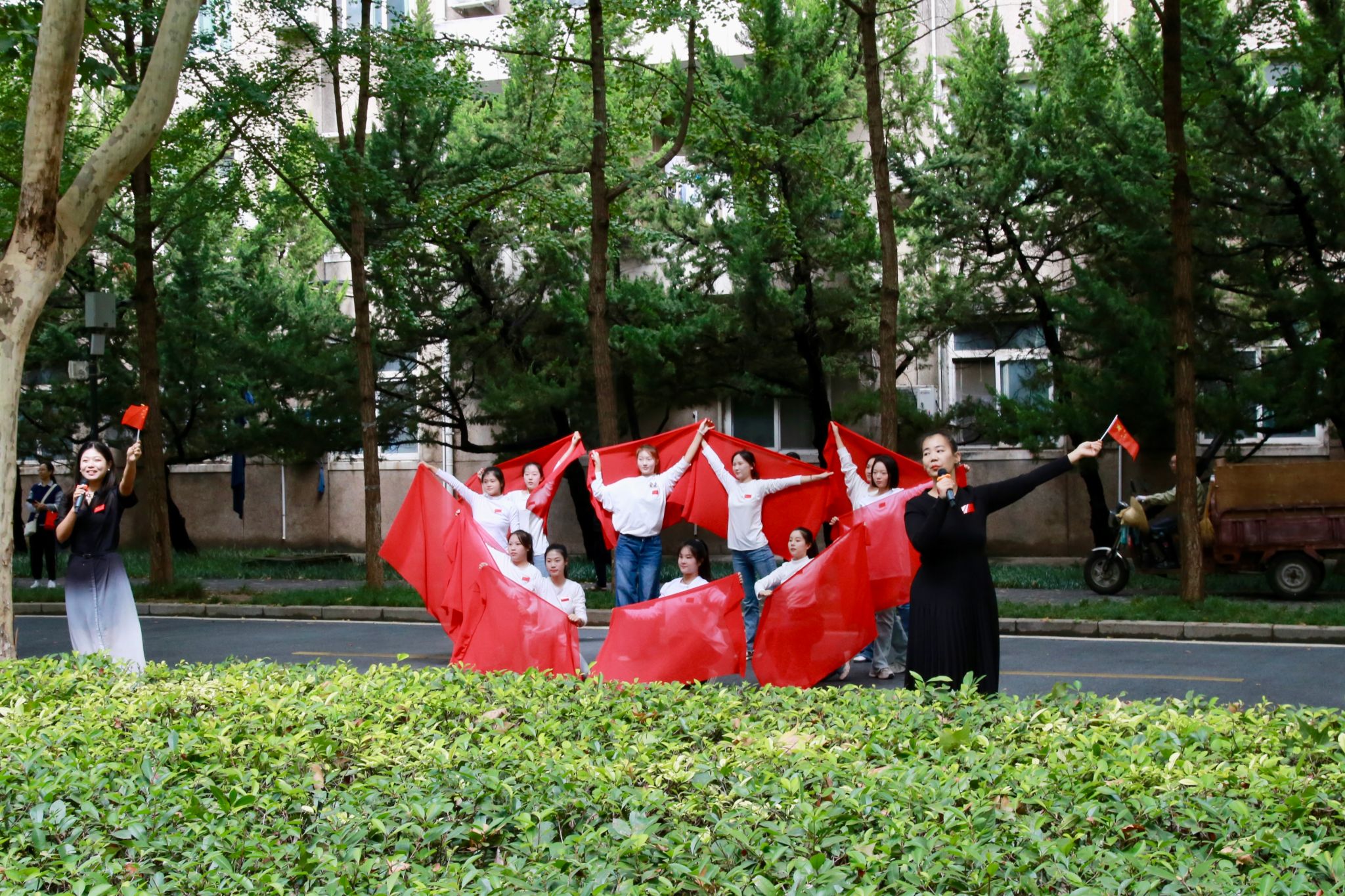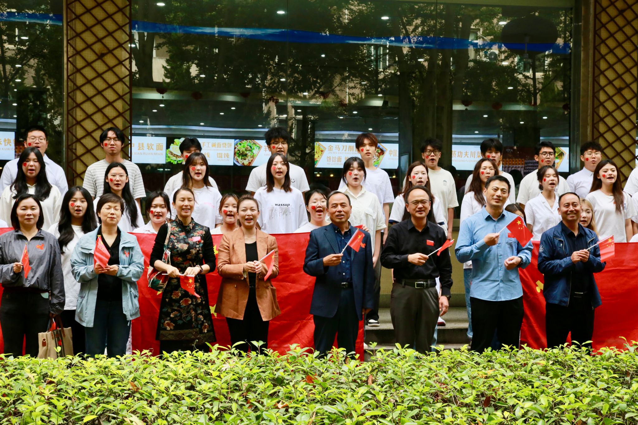 中午12点,参加快闪活动的学生在学校学生餐厅门前集合,活动在朱玥、冯洋洋两位老师领唱的歌曲《五星红旗》中拉开序幕。“五星红旗啊五星红旗,你将中华民族的心连在了一起。五星红旗啊五星红旗,你让全世界中国人扬眉吐气。”跟随着歌词,在场师生纷纷举起手中的五星红旗,跟着节奏的律动挥舞,表达着对祖国的无限敬仰与热爱。
