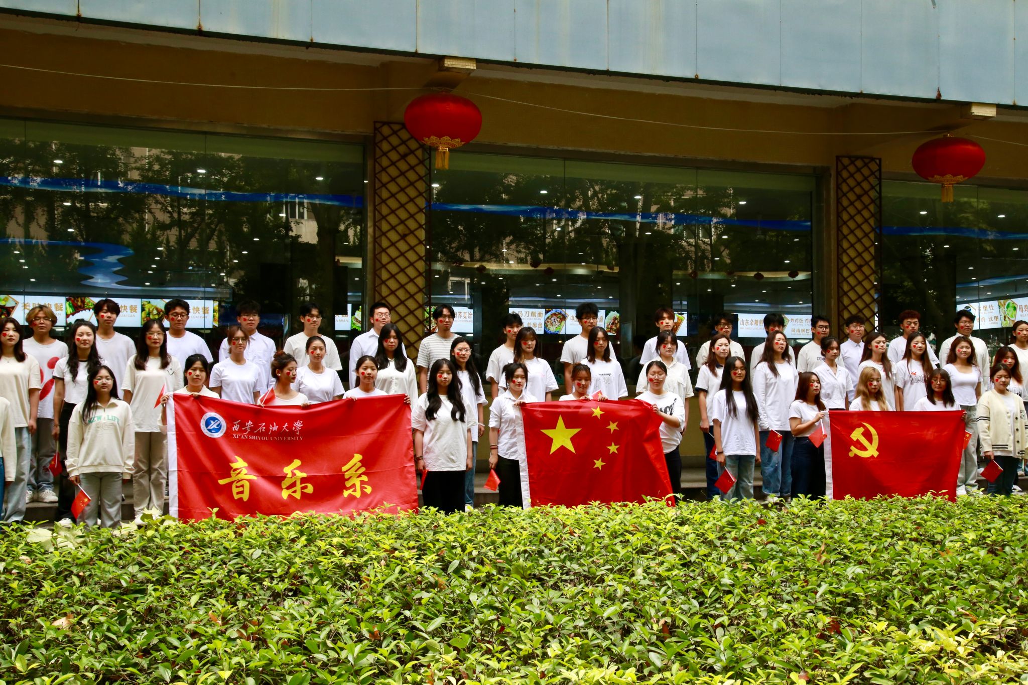 为庆祝中华人民共和国成立75周年,激发广大师生的爱国情怀,展现新时代青年的朝气蓬勃与爱国主义热情,9月30日中午12点,由音乐系和宣传部联合举办的“红歌快闪”活动在雁塔校区餐厅前成功举办。校党委委员、副校长赵健,校党委委员、宣传部部长赵承胜,国有资产处处长候琦,以及90余名音乐系师生参加了本次“红歌快闪”活动。该活动由音乐系党总支策划,声乐教研室主任田立指导,舞蹈教师何云老师编排,声乐教师朱玥、冯洋洋领唱。