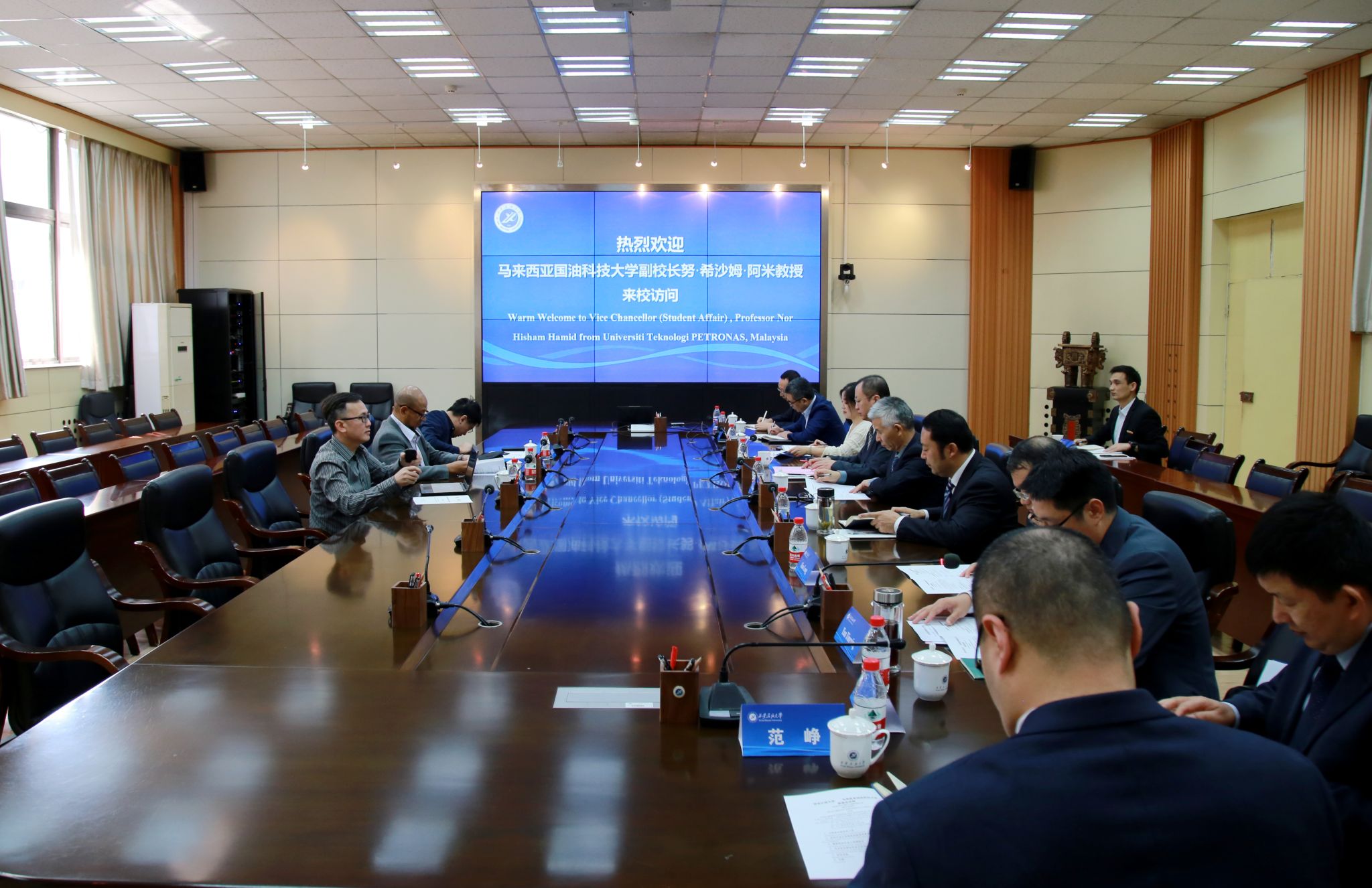 2024年10月14日上午,马来西亚国油科技大学副校长努·希沙姆·哈米德(Nor Hisham Hamid)教授、工程学院院长陈仲文(Tang Tong Boon)教授、中国合作项目负责人郑希铭(Teh Hee Min)博士等一行来校访问。两校合作座谈会在雁塔校区会议中心第二会议室举行,副校长张荣军出席座谈会并致辞。