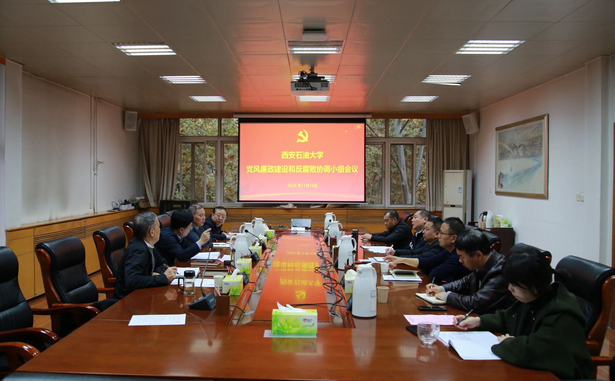 11月14日下午,学校党风廉政建设和反腐败协调小组会议在雁塔校区召开2024年第二次工作会议。党委办公室(校长办公室)、党委巡察工作办公室、组织部、人事处、审计处、财务处等部门负责人和纪检监察机构部分人员参加会议。校党委副书记、纪委书记、监察专员、工作协调小组组长王辉强主持会议。