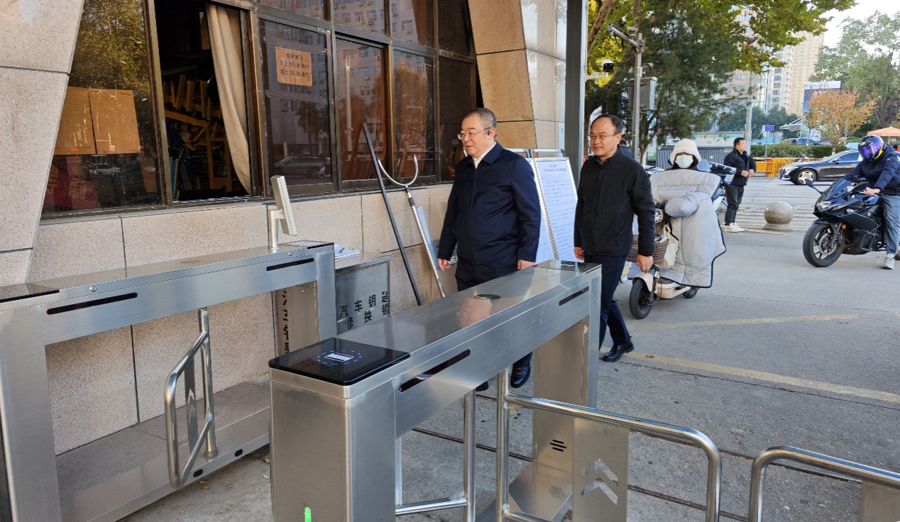 11月27日上午,在雁塔校区南门门禁系统启用首日,校党委书记常江、副校长赵健带队调研系统启用运行情况,并对校园周边综合治理情况进行了检查,稳定安全办公室负责人陪同调研。