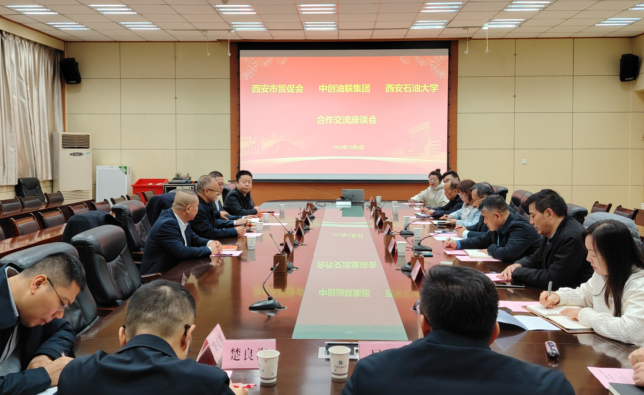 12月3日上午,西安市贸促会一级调研员冯武刚、中创油联集团董事长林晓飞一行来校洽谈合作。校党委副书记张木出席座谈会并讲话。