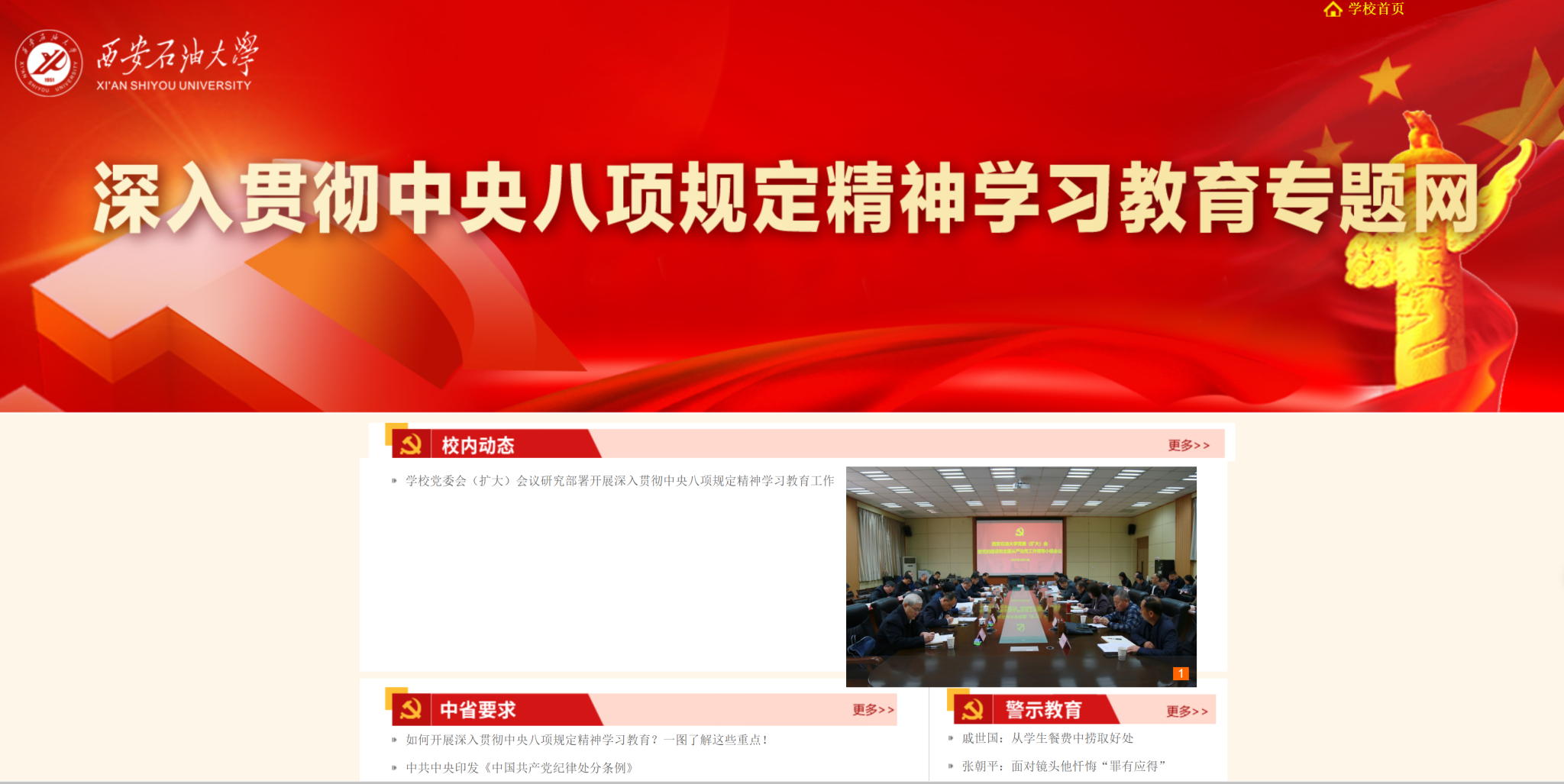 4月3日,“深入贯彻中央八项规定精神学习教育专题网站”开通上线。点击学校主页“深入贯彻中央八项规定精神学习教育”大图,即可进入专题网站。