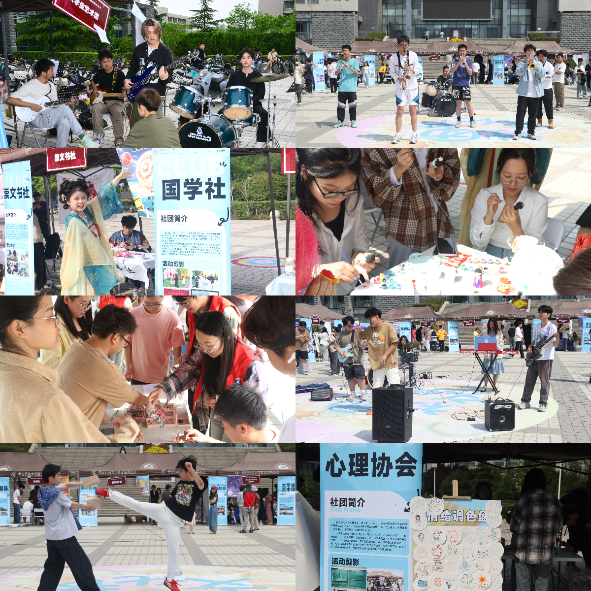在鄠邑校区图书馆南广场的“文化共赏长廊”外展活动现场,青春激昂,气氛热烈,心理协会的“解忧调色盘”,新闻社的“DIY制作”,书画协会的“书法送祝福”,可谓妙笔生花;山海史学社、通讯社、未来运动社更是推陈出新,创新版拼图复原、五子对弈、投壶比赛无不是竞技与实力的比拼;大学生艺术团、民谣社、附点八分音乐社更是为活动现场提供了极致的视听盛宴;崇文书社、国学社也带来了唯美的古典美学;辩论社、演讲与礼仪协会更是将语言与辞藻之魅力展现的淋漓尽致。