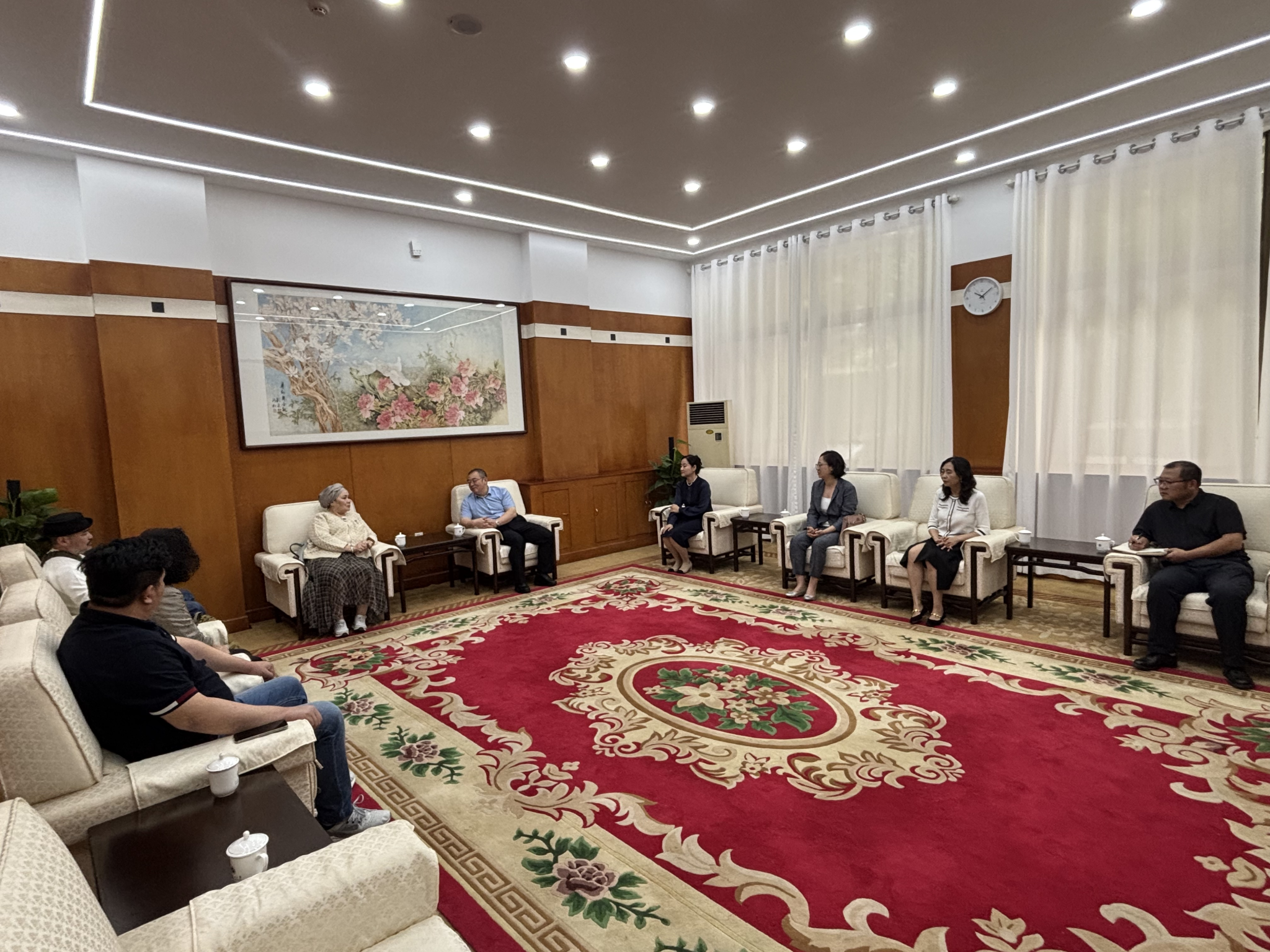 在与常江书记的座谈结束后,人文学院院长方亭、副院长方松林在雁塔校区华油能源楼813会议室与中亚艺术家团队一行就学科建设层面进行了具体的交流。座谈会上,方亭首先介绍了人文学院的历史沿革、学科建设、人才培养、师资队伍等方面的情况,着重强调了艺术设计类专业在近年间取得的长足进步。最后,方亭希望中亚艺术家团队能够与人文学院搭建常态化的沟通桥梁,进一步深化在教师专业素养提升、学生国际交流以及学科间的相互借鉴融合等领域的合作,共同寻求更大的突破与发展。