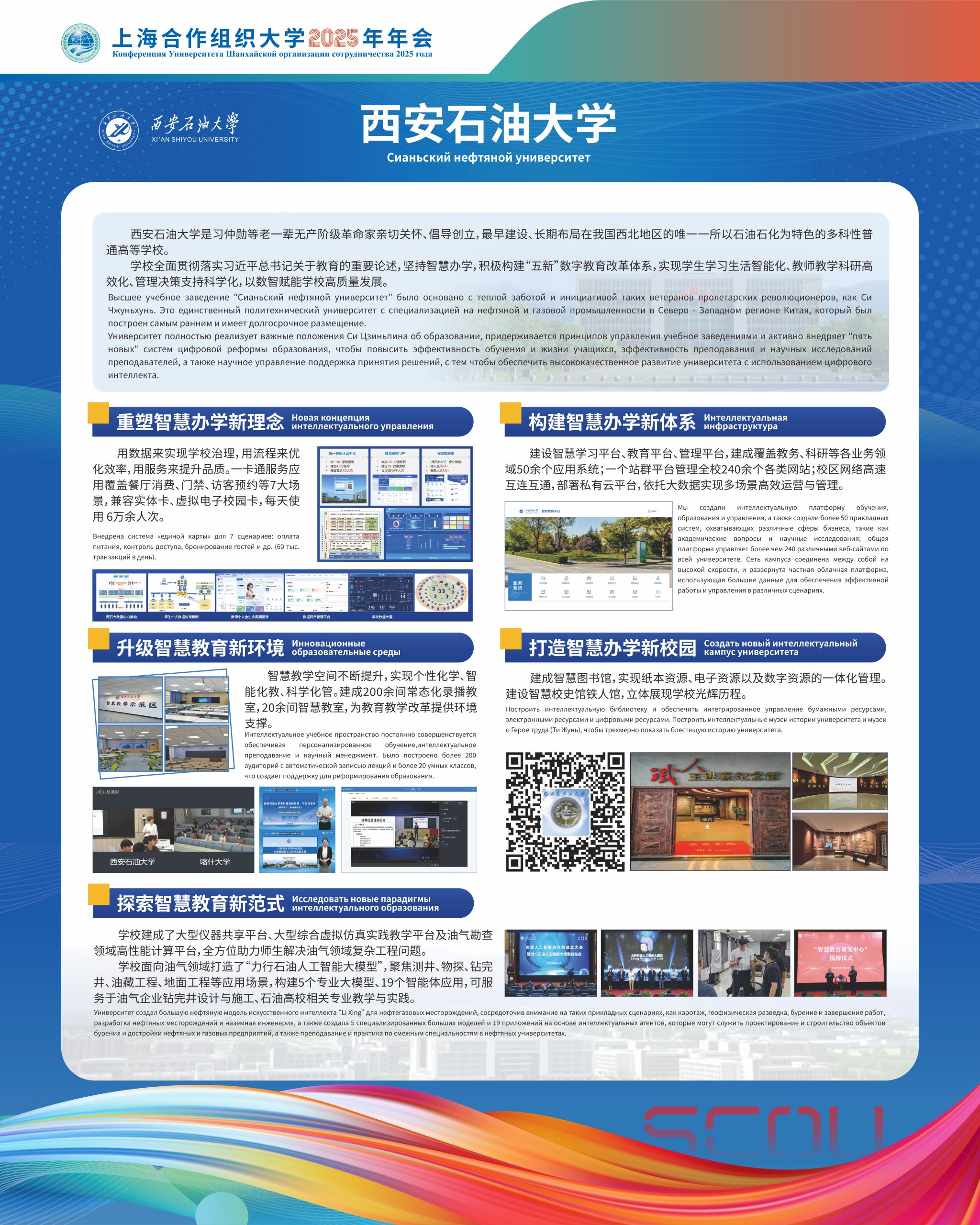 上海合作组织大学2025年年会,旨在进一步探索高等教育合作新模式,服务上合组织命运共同体建设。年会开幕式上,中国教育部部长怀进鹏、上海合作组织副秘书长贾内什∙凯恩、哈萨克斯坦科学与高等教育部部长萨亚萨特∙努尔别克、吉尔吉斯斯坦教育与科学部部长肯季尔巴耶娃∙多戈杜尔库尔∙沙尔谢耶芙娜、俄罗斯科学和高等教育部副部长莫吉列夫斯基∙康斯坦丁∙尹里奇、塔吉克斯坦教育和科学部部长拉希姆∙哈姆罗∙萨义德佐达、上海合作组织大学校长菲利波夫∙弗拉基米尔∙米哈伊洛维奇等致辞。