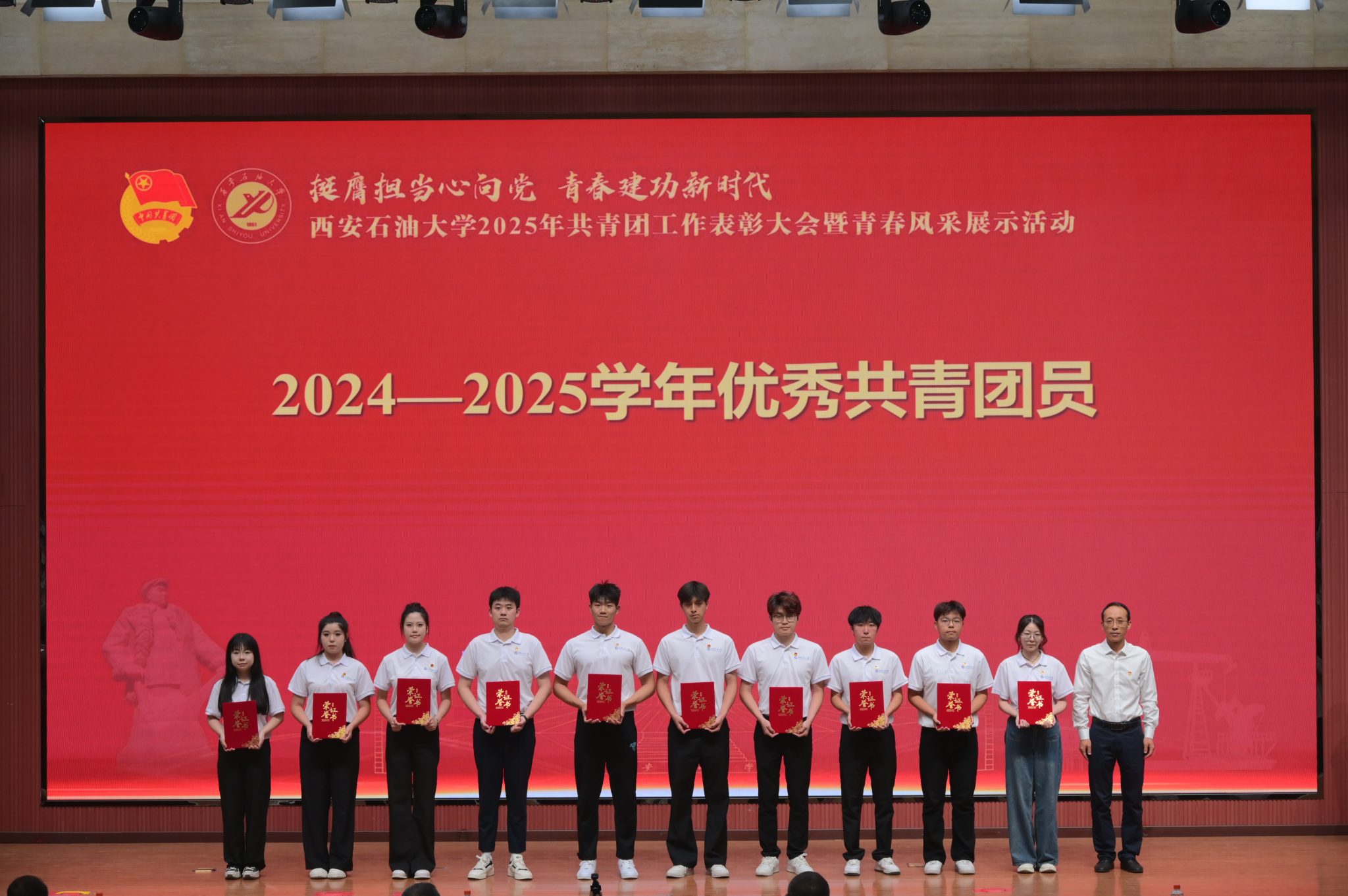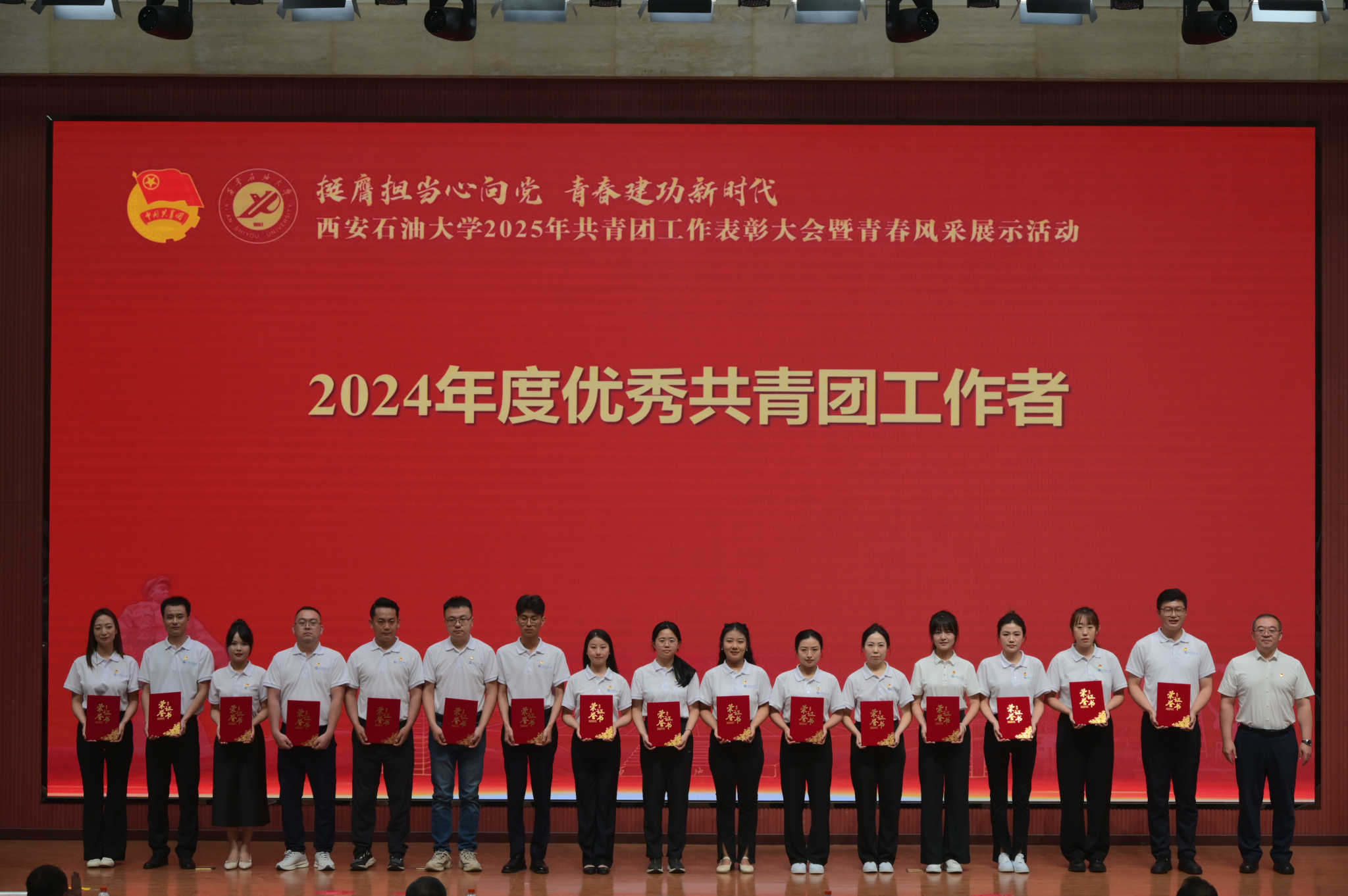 5月17日下午,“挺膺担当心向党 青春建功新时代”Beat365唯一官方网站2025年共青团工作表彰大会暨青春风采展示活动在鄠邑校区弘石学术报告厅举行。校党委书记常江、副书记张木,副校长张君涛、赵健,党委办公室(校长办公室)、党委组织部、党委宣传部、党委学生工作部、党委教师工作部、党委保卫部、教务处、研究生工作部、后勤处、马克思主义学院负责人,各院(系)主管学生工作书记或副书记,全体辅导员,获奖师生代表500余人参加大会。