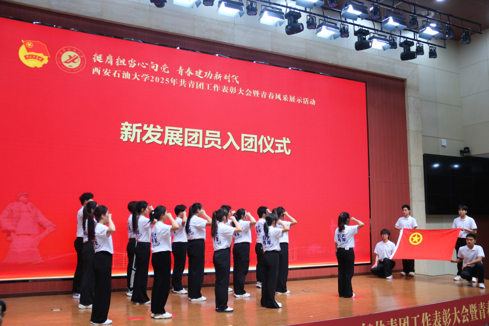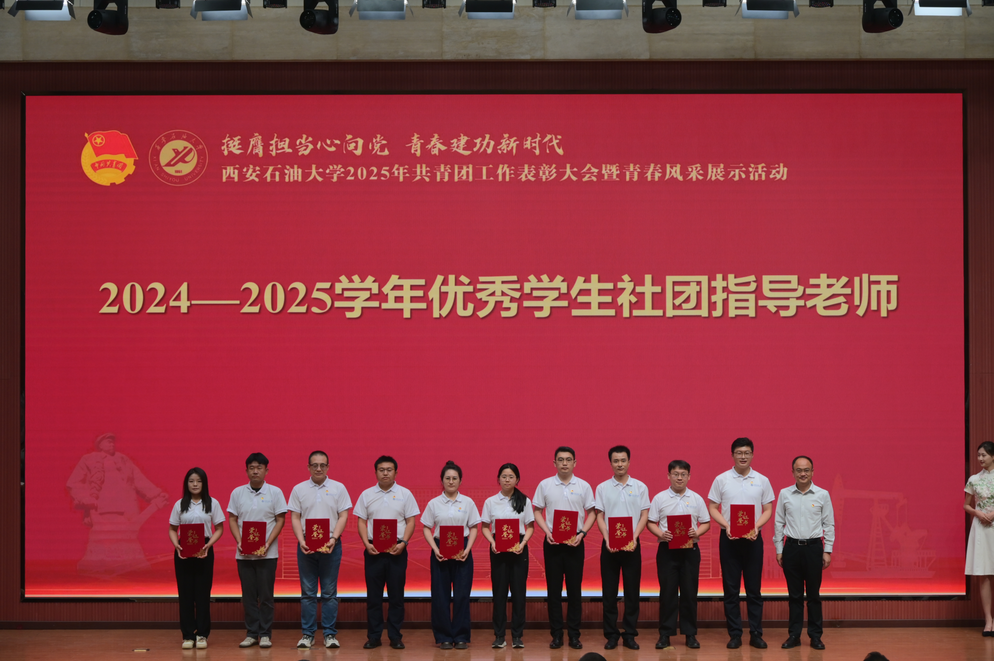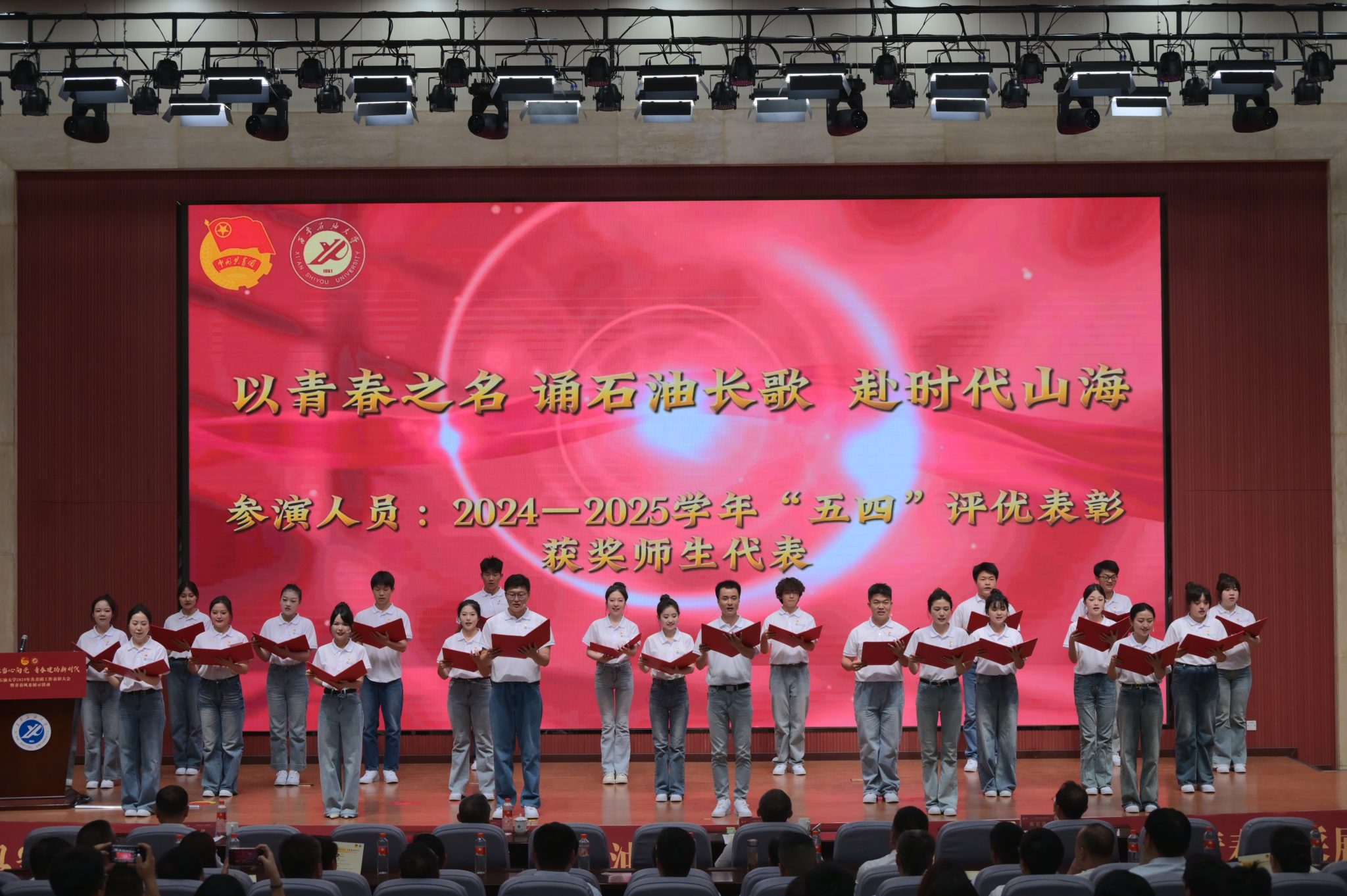 由获奖师生代表演绎的原创诗朗诵《以青春之名,诵石油长歌,赴时代山海》,将“我为祖国献石油”的豪情与“强国有我”的铮铮誓言完美融合,舞蹈《有我》带领大家共赴一场跨越时空的精神对话,领略百年共青团血脉里奔涌的滚烫星河。