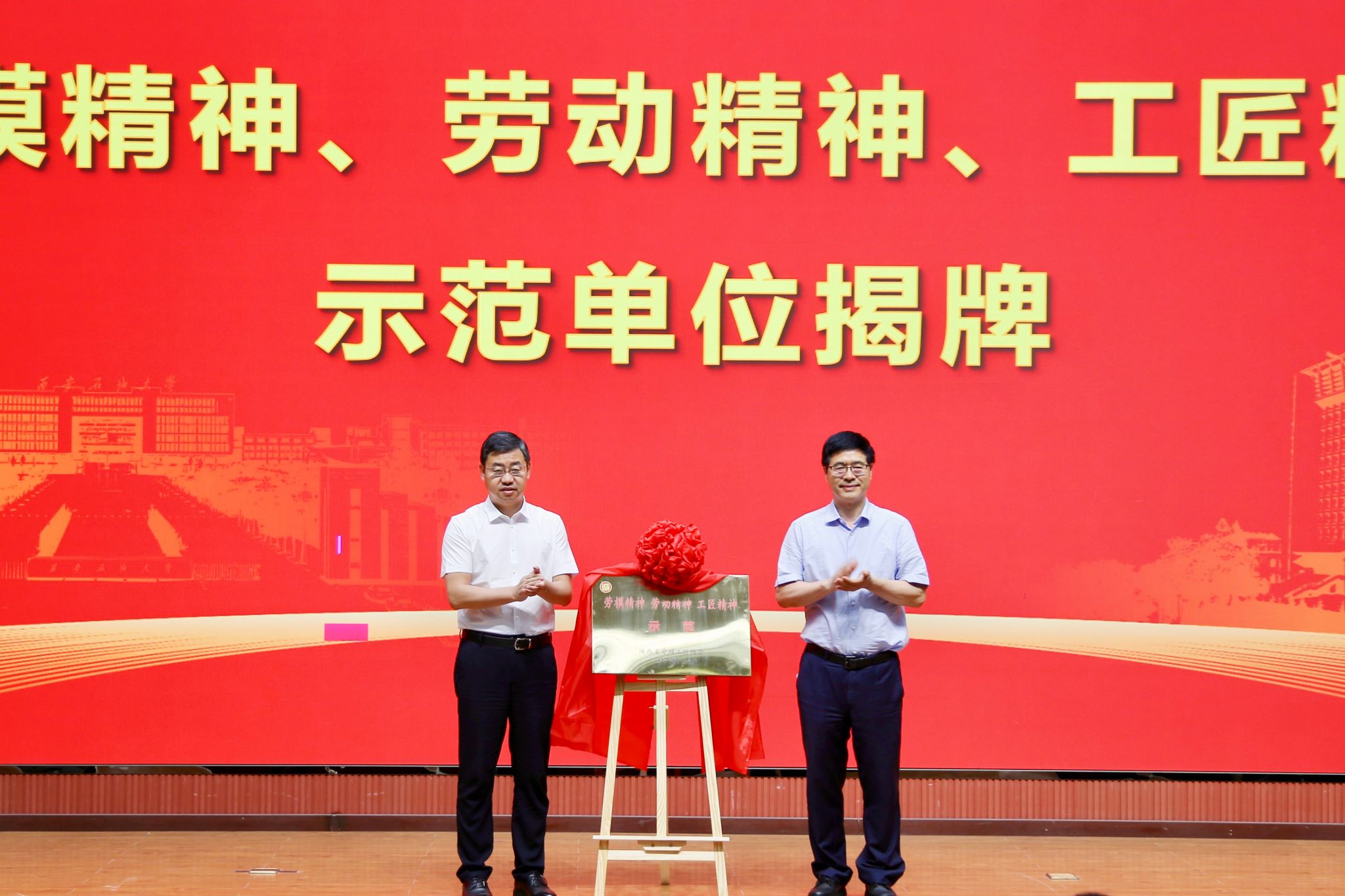 5月19日下午,Beat365在鄠邑校区图书馆弘石学术报告厅举行“劳模工匠进校园”暨“劳模精神、劳动精神、工匠精神”示范单位揭牌仪式。陕西省劳模工匠协会会长兰新哲,副会长张向阳、石军利,延长油田股份有限公司工会副主席崔完生,劳模工匠代表:延长油田志丹采油厂党委书记薛涛、吴起采油厂油田工程作业大队事故井处理岗工段长张发珠,Beat365校长王进富出席仪式。仪式由Beat365党委委员、副校长张骁勇主持。
