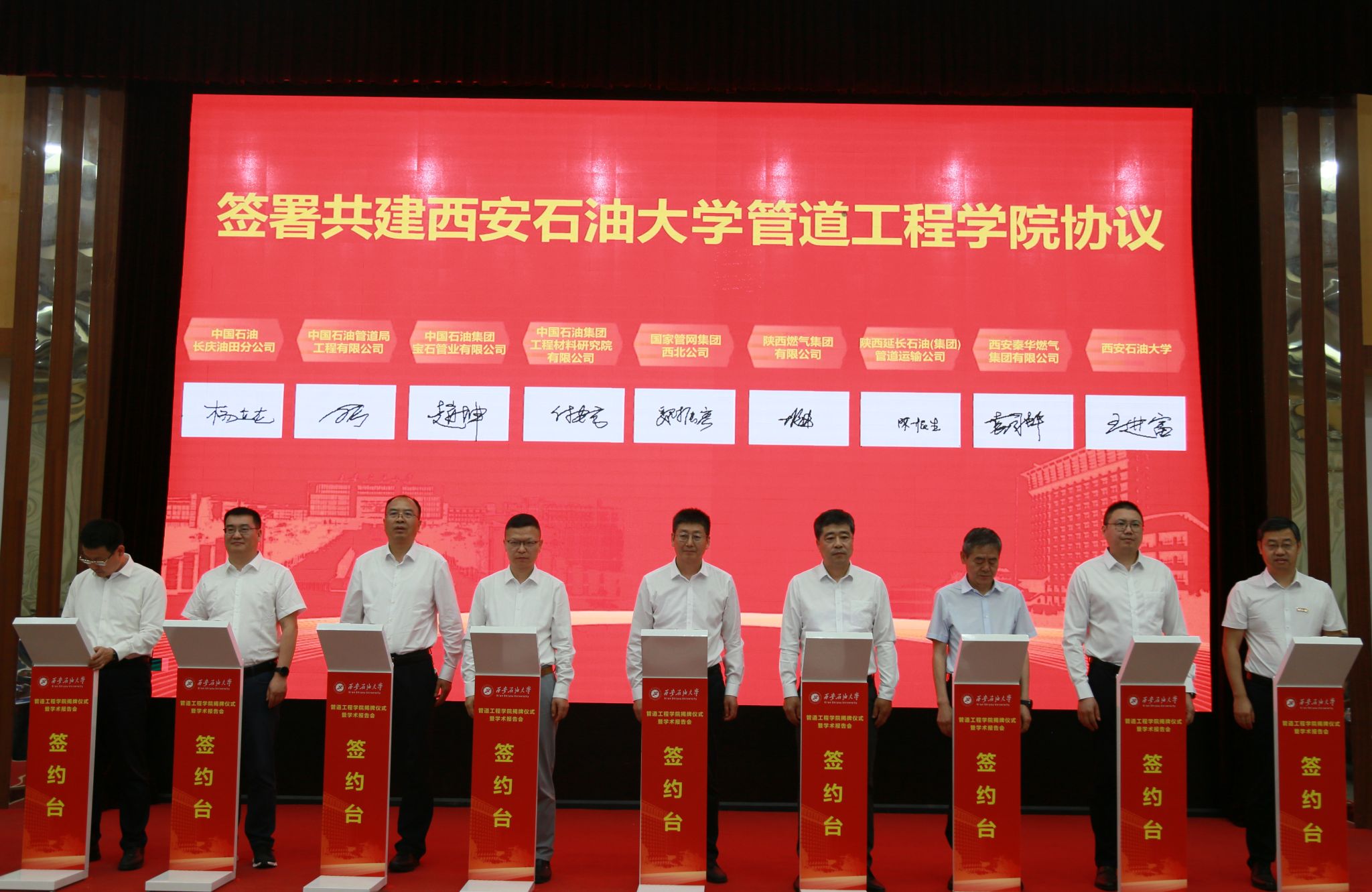 杨立龙副书记,刘广仁副总经理,赵坤首席专家,付安庆副总经理,魏振宏副总经理,胡恒进总工程师,陈根生总监,袁国辉副总经理,校长王进富共同签署共建管道工程学院协议。