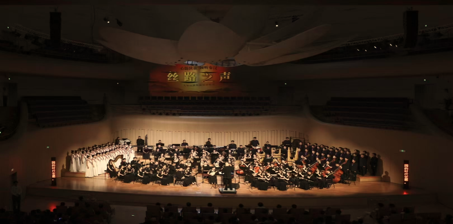《丝路之声》由“金钟奖”作品奖得主、青年作曲家王云飞倾力创作,一级指挥、中央民族乐团首席指挥刘沙执棒首演。本场演出集百名演奏家的物理规模、多元乐器的文化纵深、顶尖艺术家的技术高度,集“器、乐、情”于一体,完成对丝绸之路的当代音乐叙事,展现中国民族音乐在时代的包容品格与创新势能。音乐会以“物之声”“乐之声”“情之声”三大篇章叙事:“物之声”中,打击乐与弦乐的《丝》勾勒丝绸文明的流动之美,双二胡协奏曲《马》重现古道驼铃;“乐之声”里,萨塔尔、冬不拉等丝路乐器轮番登场,《炫》通过手鼓互动复刻长安西市盛景。作为音乐会“情之声”篇章的压轴之作,《世界之门》以交响化人声与民族管弦乐交织,构建起连接古今的音乐时空。合唱团学子以饱满张力演绎“世界之门,八音和鸣,与世共长”的歌词,既回荡着古丝路“万国笙箫”的历史余韵,更彰显“一带一路”倡议下开放合作的时代强音。当和声在音乐厅激荡,千余名观众以经久掌声为这场文明对话喝彩。