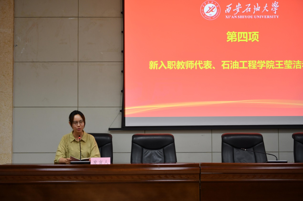 新入职教师代表、石油工程学院王莹洁老师代表新入职教师做交流发言,表达了为建设高水平教学研究型大学做贡献的决心和信心。