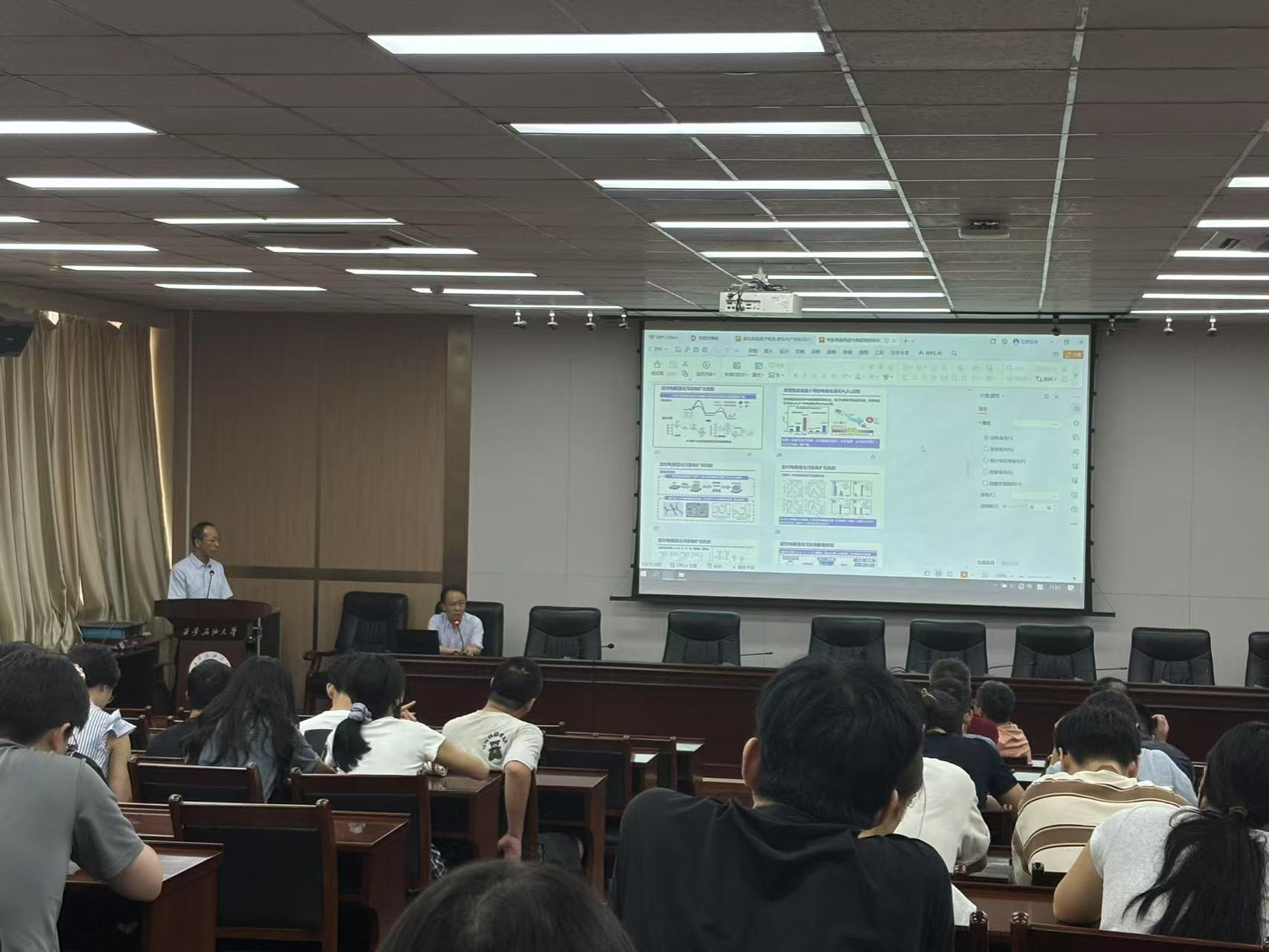 化学化工学院、科研处有关负责人,化学化工学院、材料科学与工程学院、新能源学院等学院师生等近100人参加报告会。
