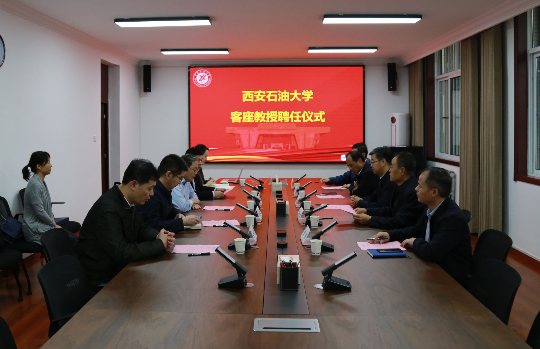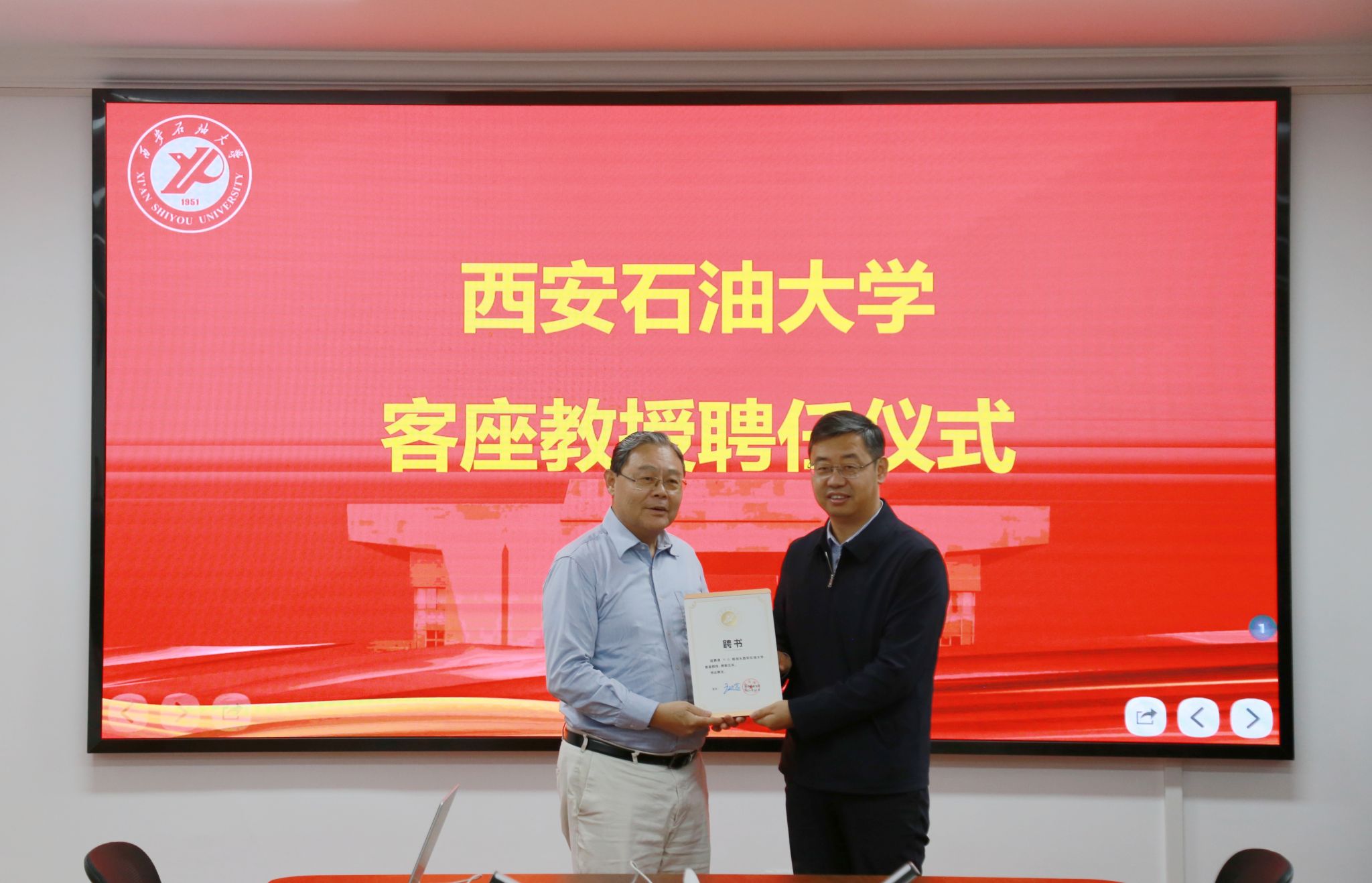 聘任仪式前,校长王进富在鄠邑校区贵宾室与邹进教授进行了亲切会谈,对邹教授的到来表示诚挚欢迎,并就学校红色基因与石油精神传承、校园文化建设、学科优化布局、人才队伍建设等方面进行交流,期待邹进教授能够充分发挥专业优势与学术国际影响力,提升学校学科发展水平。