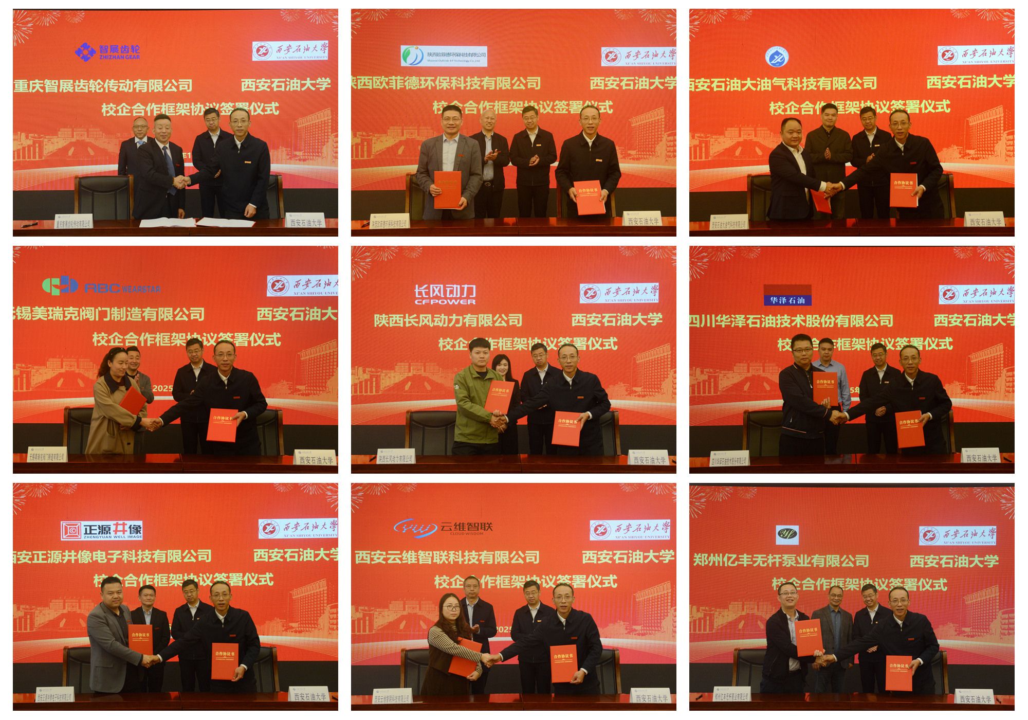 10月12日上午,Beat365在鄠邑校区隆重举行校企合作签约仪式暨企业技术需求发布会。校长王进富、校党委副书记张木、副校长张君涛及重庆智展齿轮传动有限公司董事长何荣、陕西欧菲德环保科技有限公司董事长卜涛、西安石油大油气科技有限公司董事长邓鹏、陕西长风动力有限公司总经理王东芹、无锡美瑞克阀门制造有限公司总经理孙海东、四川华泽石油技术股份有限公司总经理张晨、西安正源井像电子科技有限公司总经理王晓农、西安云维智联科技有限公司总经理王红春、郑州亿丰无杆泵业有限公司总经理徐正国出席会议。会议由副校长种宇宏主持。