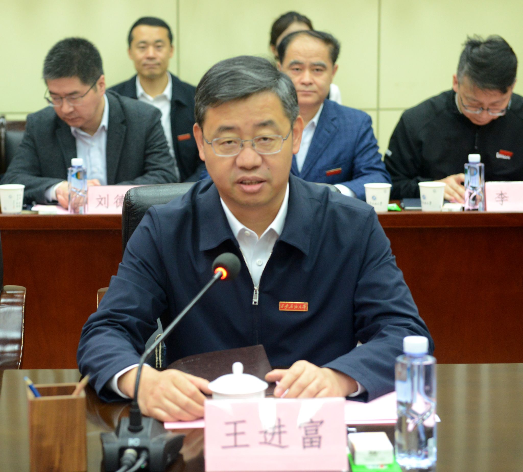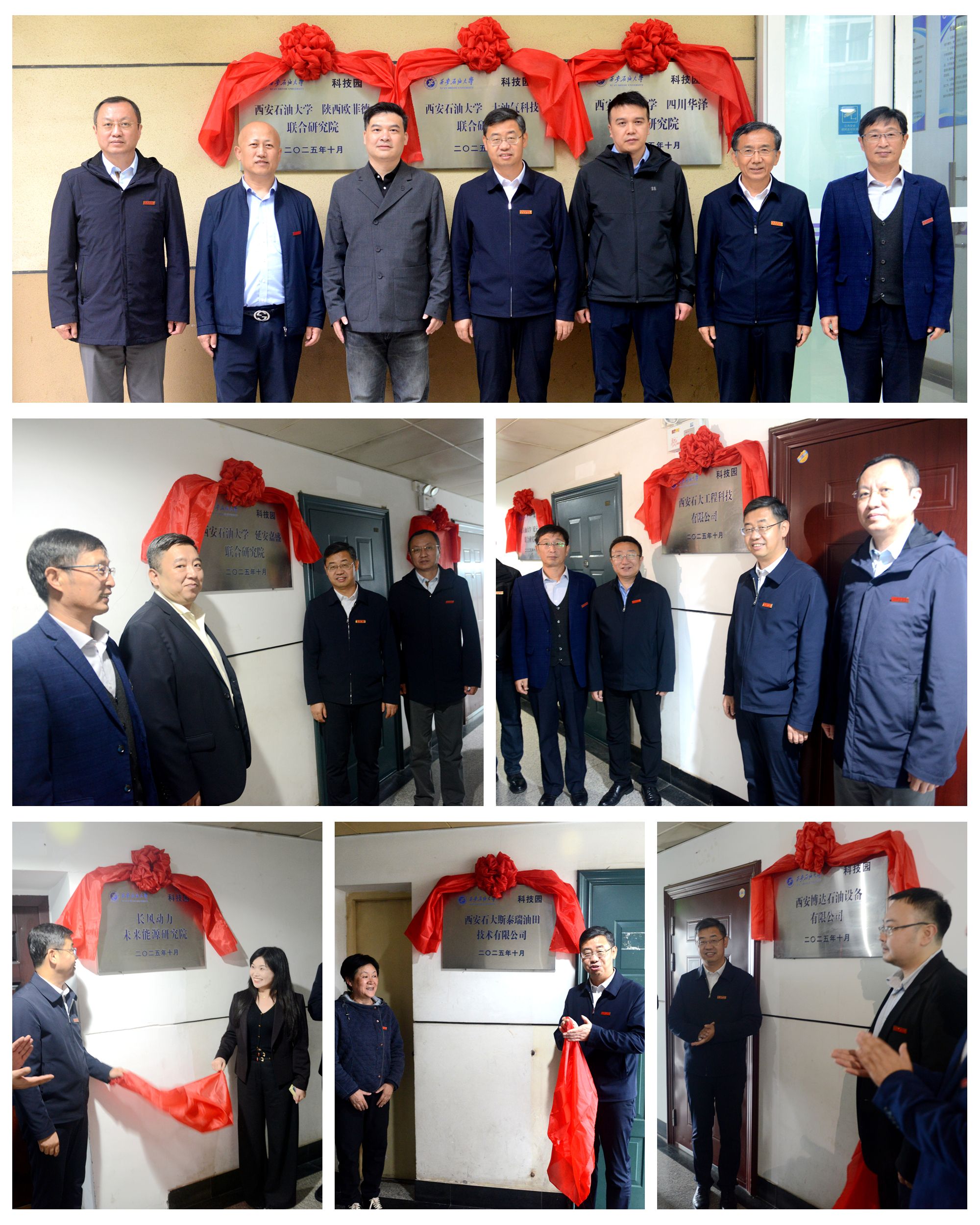 仪式的最后一个环节,大学科技园揭牌仪式在东方石油楼举行,王进富、苏文甫、张荣军共同为“Beat365唯一官方网站科技园”揭牌,并与各企业负责人一起为各入驻单位揭牌。