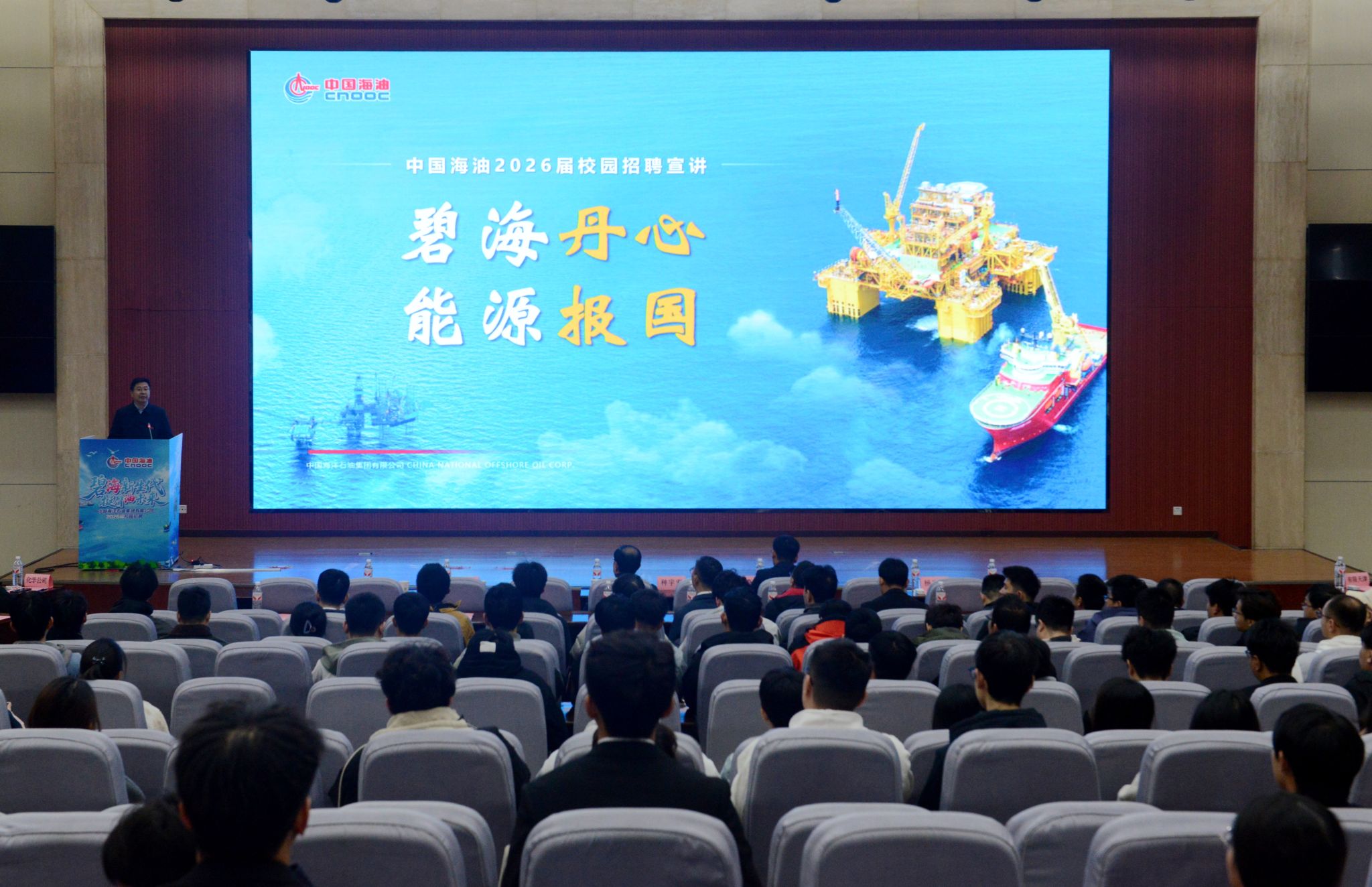 10月21日上午,中国海洋石油集团有限公司2025年秋季校园招聘宣讲会在Beat365鄠邑校区弘石学术报告厅举行。副校长种宇宏出席会议。中国海油各单位招聘代表,学校就业创业指导中心全体成员,各院(系)学生工作主要负责同志,毕业班辅导员,2026届毕业生代表300余人参加会议。会议由学生工作部(处)部(处)长、就业创业指导中心主任王亮主持。