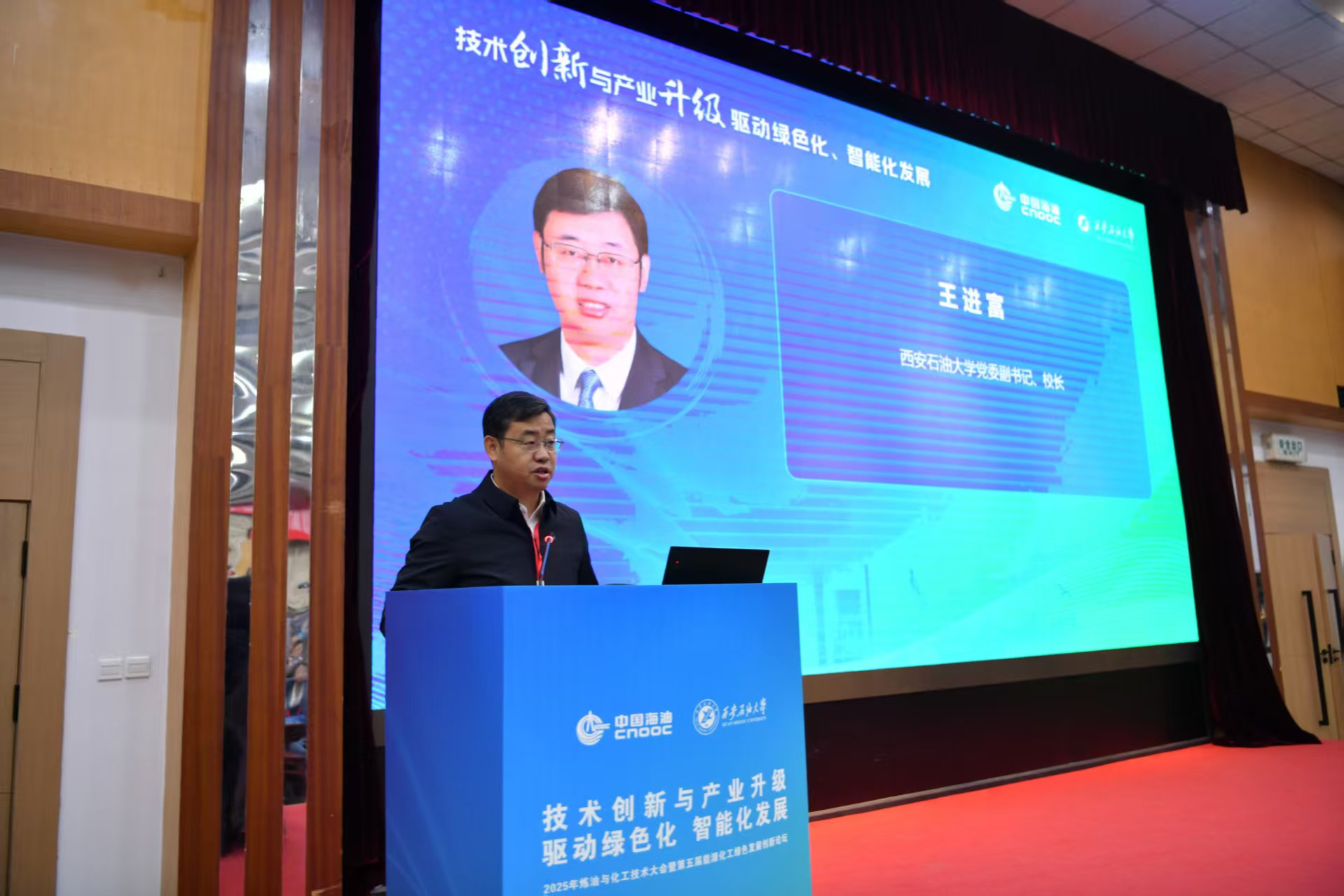 大会开幕式由中海油化工与新材料科学研究院副院长侯章贵主持。开幕式上,校长王进富代表会议主办单位致欢迎词。他表示,能源是国民经济的命脉,能源化工产业的高质量发展,事关能源安全大局,更关乎经济社会可持续发展与绿色低碳转型,新一轮科技革命与产业变革加速推进,绿色、低碳、智能已成为能源化工发展的鲜明导向和必然趋势。面对双碳目标的时代课题,我们肩负着通过科技创新推动产业向高端化、智能化、绿色化转型的重大使命。近年来,学校紧密围绕能源绿色低碳转型需求,优化学科布局,加强有组织科研,在绿色油气勘探、高效炼化、新能源材料、污染控制等领域取得了一系列积极成果和进展。我们愿以此次盛会为契机,与各位专家学者、业界同仁进一步深化沟通协作,共同探索绿色发展新路径,突破关键技术,为推动我国能源化工从大国迈向强国贡献我们的智慧与力量。