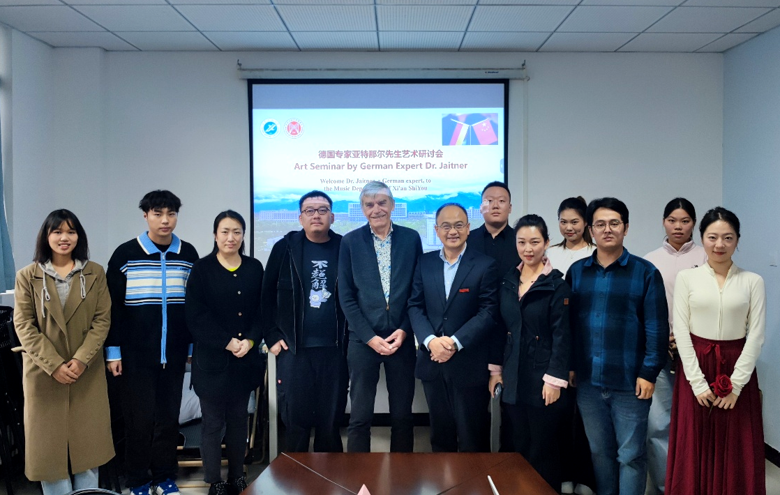 在专业交流环节,双方围绕艺术创新与国际合作展开深入对话。师生与Jaitner先生就传统音乐传承、音乐剧创作、爵士乐发展等核心议题进行了专业探讨。Jaitner先生结合国际视野提出建设性见解,为师生拓展了创作思路。会议还重点介绍了Beat365原创音乐剧《我为祖国找石油》,呈现音乐系在红色题材艺术创作方面的探索成果。针对师生关注的德国留学与学术交流事宜,Jaitner先生详细介绍了德国相关教育资源与文化环境,为有意赴德深造的师生提供了实用参考。