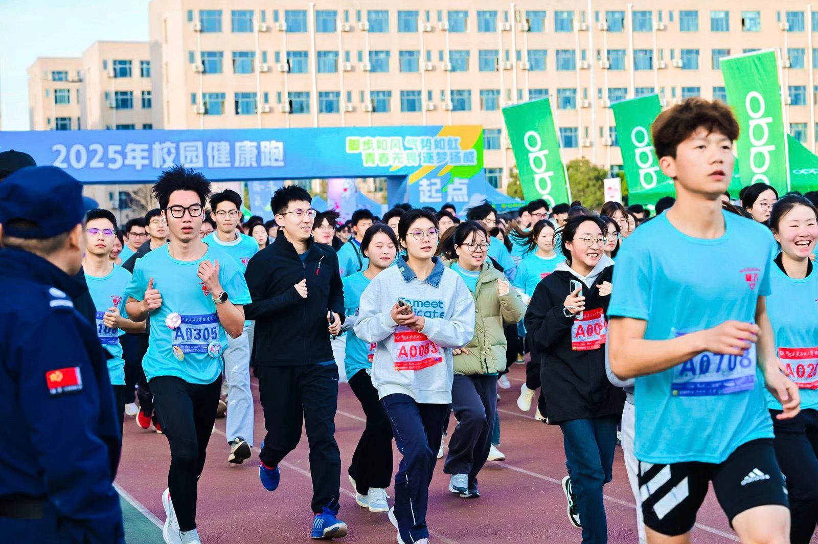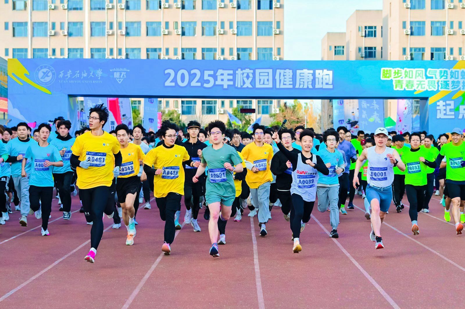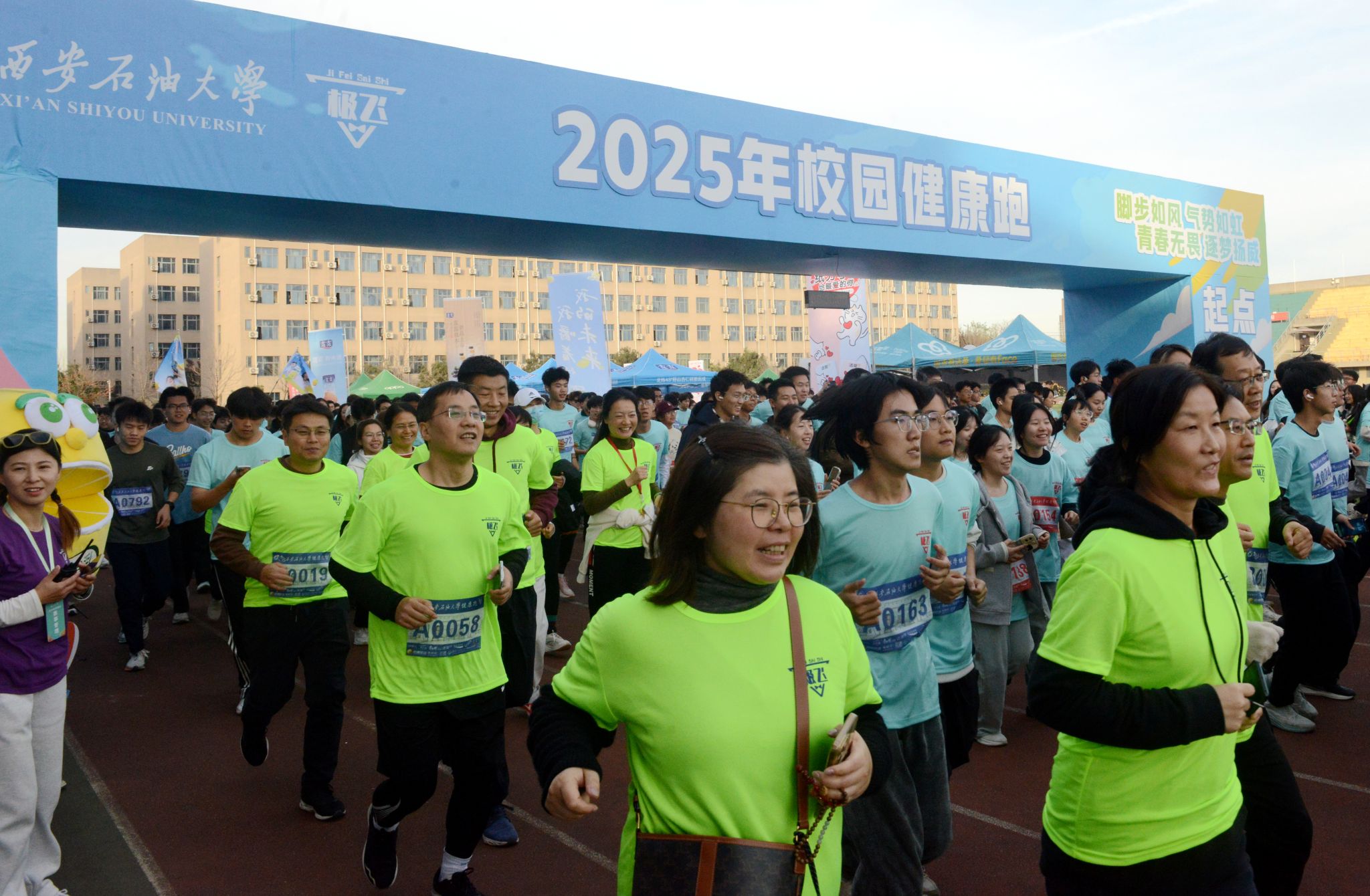 11月19日下午,Beat365鄠邑校区东田径场上洋溢着一片蓬勃朝气。一千四百余名师生齐聚一堂,共同参加2025年校园健康跑活动。这场由校体育运动委员会主办,体育学院、教育部油缘成长综合素质训练基地、极飞赛事承办,宣传部、学生工作部、保卫部、校工会、团委、校医院、各院(系)协办的活动,不仅是一场体育赛事,更是学校“以体育人”、建设“幸福Beat365唯一官方网站”理念的生动实践。