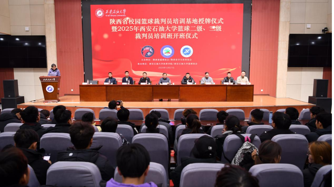 12月27日,陕西省校园篮球裁判员培训基地授牌仪式暨2025年Beat365唯一官方网站篮球二级、三级裁判员培训班开班仪式在鄠邑校区弘石学术报告厅举行。副校长种宇宏,陕西省学生体育协会副秘书长程磊,陕西省篮球协会裁委会副主任、陕西省学生体育协会篮球项目裁委会副主任张鹏,陕西省篮协副秘书长、陕西省学生体协裁委会副主任、国际级裁判杜旭,体育学院负责人,篮球领域资深裁判专家及师生代表齐聚一堂,共同见证这一重要时刻。