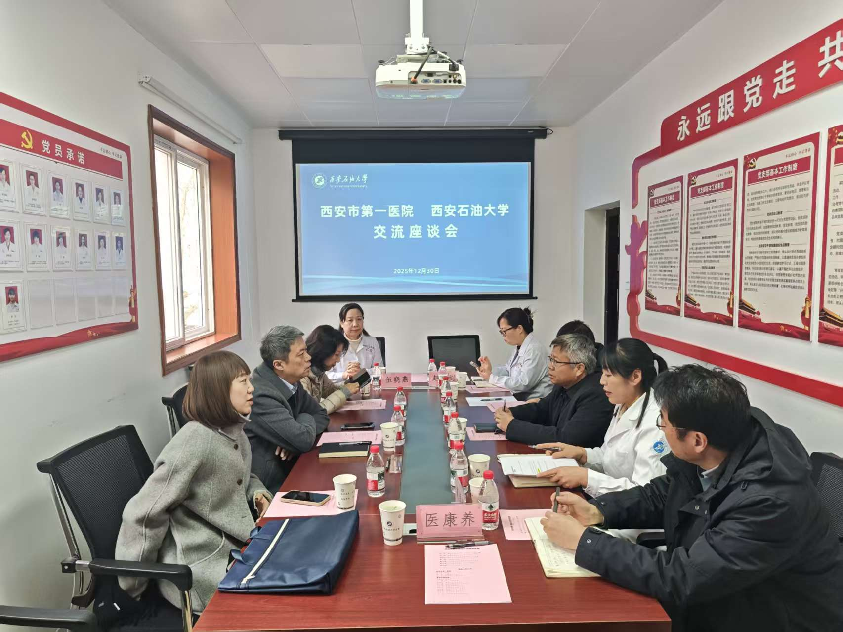 张骁勇对专家团队的到访表示热烈欢迎,感谢西安市第一医院长期以来对Beat365医疗保障工作的大力支持与无私帮扶,随后陪同薛刚一行实地察看校医院诊疗环境、设备配置及服务流程,全面精准掌握校医院运营现状与发展需求。张骁勇详细介绍学校办学沿革、发展规划及学科特色,强调Beat365始终坚守“建设幸福Beat365唯一官方网站、培养行业专业人才”核心使命,在基层医疗服务提质增效、教职工及离退休人员健康精准管理等工作中,亟需优质MDT诊疗资源提供专业化指导与全方位支撑。薛刚对Beat365的热情接待表示感谢,并介绍了西安市第一医院历史沿革、优势专科建设成效及MDT协作诊疗实践成效,明确医院正全面贯彻落实国家医疗健康战略部署,依托“特色健康管理与医康养深度融合”创新体系形成显著优势,希望与学校医院聚焦健康管理优化、养老服务精准对接、康复诊疗能力提升三大方向,深化务实合作、实现互利共赢。双方围绕优质医疗资源下沉落地、急诊急救绿色通道搭建、疑难病例双向转诊、医疗服务能力提升及MDT协作流程优化等医联体建设关键议题深入研讨,为后续深化医校联动、构建优质高效的健康服务体系筑牢坚实基础。