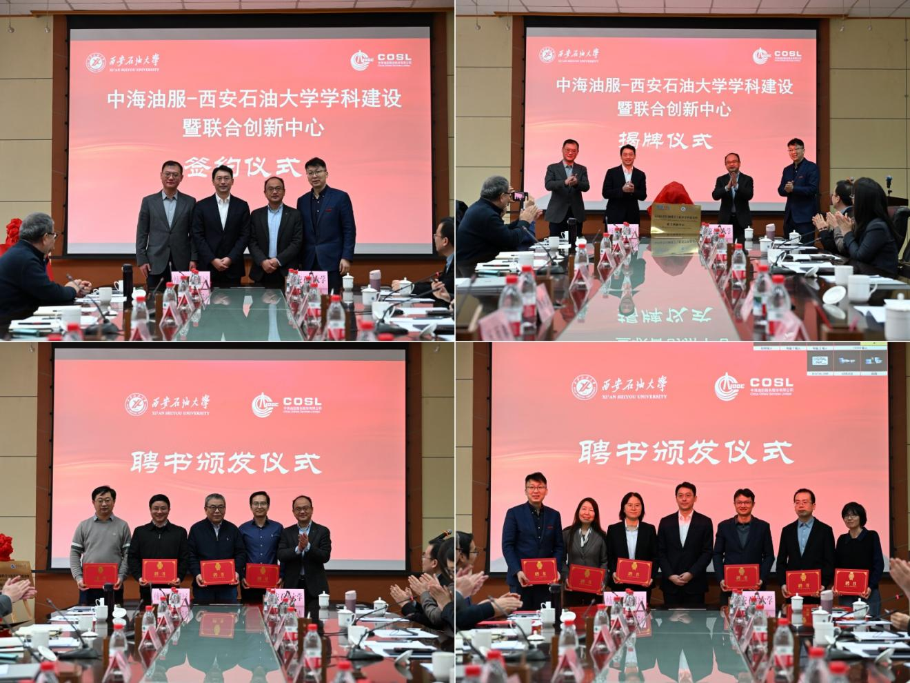 在与会人员的共同见证下,双方代表正式签署合作协议,并为“定向钻井控制科学与技术学科建设基地”与“联合创新中心”揭牌。仪式上还宣读了学科委员会名单,赵健、尚捷向委员代表颁发聘书。