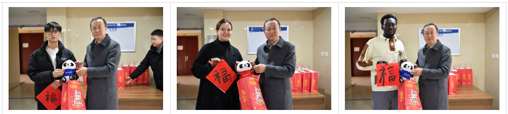 慰问期间,张荣军向在场国际学生赠送慰问品,寄语学生马年如意,并与大家合影留念。