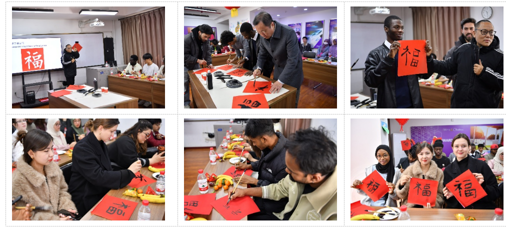 活动现场,张荣军亲笔示范毛笔“福”字写法,亲手指导学生执笔、运墨,耐心解答同学们的疑问、亲切交流书写心得,让同学们在亲身实践中真切感受中国书法的独特魅力。国际教育学院教师同步讲解“福”字的历史起源和文化内涵,详细阐释了“五福临门”所代表的美好寓意,以及贴“福”字、写“福”字等民俗背后寄托的吉祥祈愿,师生互动气氛热烈。