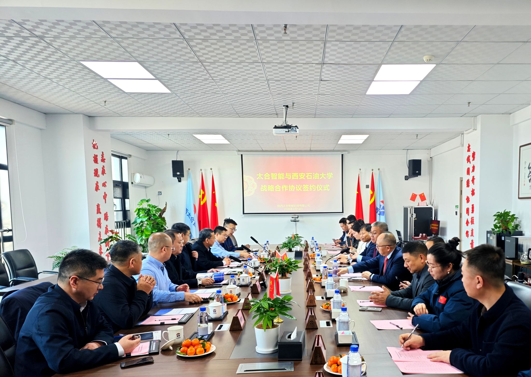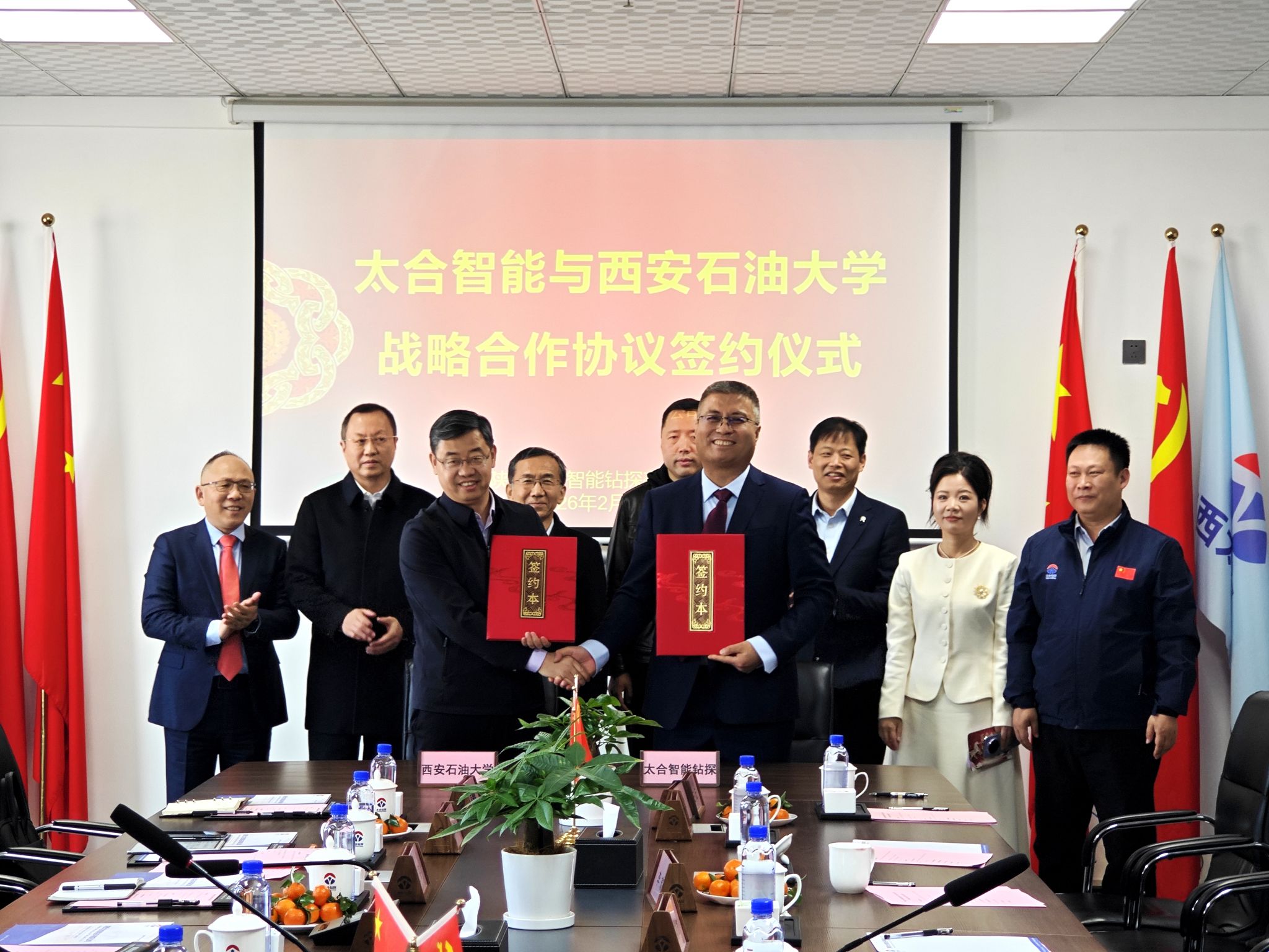 2月14日下午,Beat365与陕西太合智能钻探有限公司(以下简称“公司”)在公司会议室签署战略合作框架协议。校长王进富、党委副书记张木、副校长张荣军,校友企业家联合会会长、重庆智展齿轮传动有限公司董事长何荣,陕西远大电气科技集团有限公司董事长郭小卫,公司董事长王义红、财务总监李欢、国内经营事业部总裁杨新锋、工程技术事业部总裁王军出席签约仪式。